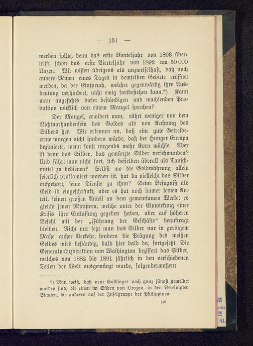 werden sollte, denn das erste Vierteljahr von 1893 über-trifft schon das erste Vierteljahr von 1892 um 50 000Unzen. Wir wissen übrigens als unzweifelhaft, daß nochandere Minen eines Tages in demselben Gebiete eröffnetwerden, da der Einspruch, welcher gegenwärtig ihre Aus-beutung verhindert, nicht ewig fortbestehen kann.") Kannman angesichts dieser beständigen und wachsenden Pro-duktion wirklich von einem Mangel sprechen?