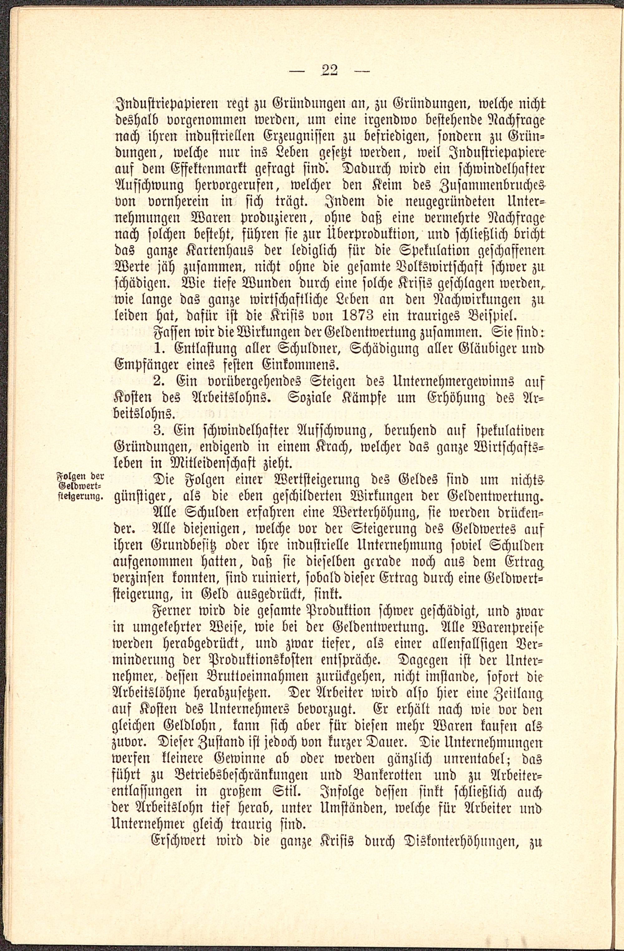 Ferner wird die gesamte Produktion schwer geschädigt, und zwarin umgekehrter Weise, wie bei der Geldentwertung. Alle Warenpreisewerden herabgedrückt, und zwar tiefer, als einer allenfallsigen Ver-minderung der Produktionskosten entspräche. Dagegen ist der Unter-nehmer, dessen Bruttoeinnahmen zurückgehen, nicht imstande, sofort dieArbeitslöhne herabzusetzen. Der Arbeiter wird also hier eine Zeitlangauf Kosten des Unternehmers bevorzugt. Er erhält nach wie vor dengleichen Geldlohn, kann sich aber für diesen mehr Waren kaufen alszuvor. Dieser Zustand ist jedoch von kurzer Dauer. Die Unternehmungenwerfen kleinere Gewinne ab oder werden gänzlich unrentabel; dasführt zu Betriebsbeschränkungen und Bankerotten und zu Arbeiter-entlassungen in großem Stil. Infolge dessen sinkt schließlich auchder Arbeitslohn tief herab, unter Umständen, welche für Arbeiter undUnternehmer gleich traurig siud.