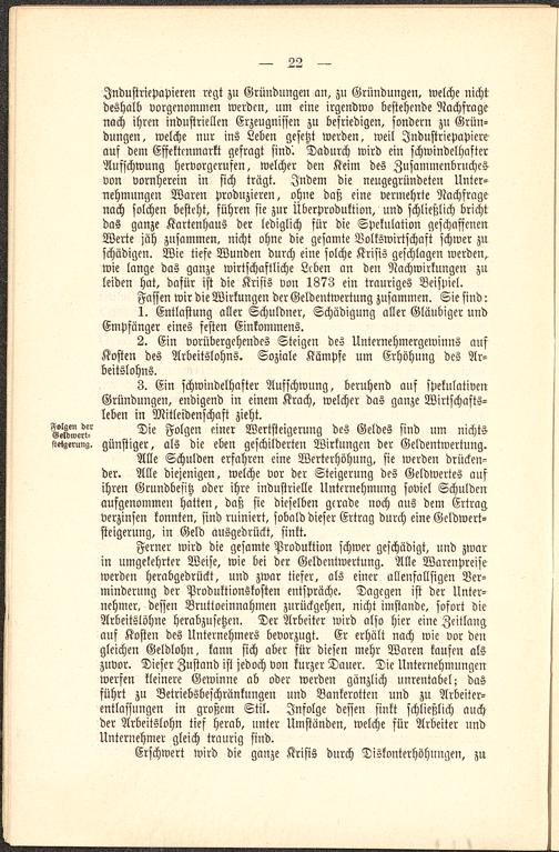 Alle Schulden erfahren eine Werterhöhung, sie werden drücken-der. Alle diejenigen, welche vor der Steigerung des Geldwertes aufihren Grundbesitz oder ihre industrielle Unternehmung soviel Schuldenaufgenommen hatten, daß sie dieselben gerade noch aus dem Ertragverzinsen konnten, sind ruiniert, sobald dieser Ertrag durch eine Geldwert-steigerung, in Geld ausgedrückt, sinkt.