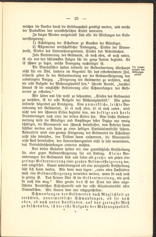 Die Bimetallisten halten teilweise die Geldentwertung überhaupt ^^"Anicht für ein Übel, sondern im Gegenteil für das erstrebenswerte Ziel, WKhrungs.teilweise geben sie der Geldentwertung vor der Gcldwertsteigerung denunbedingten Vorzug. „Steigerung des Geldwertes zu verhüten, mußdie erste Aufgabe der Währungspolitik sein," schreibt Arendt, „darüberhinaus ist die möglichste Behinderung aller Schwankungen des Geld-wertes zu erstreben."