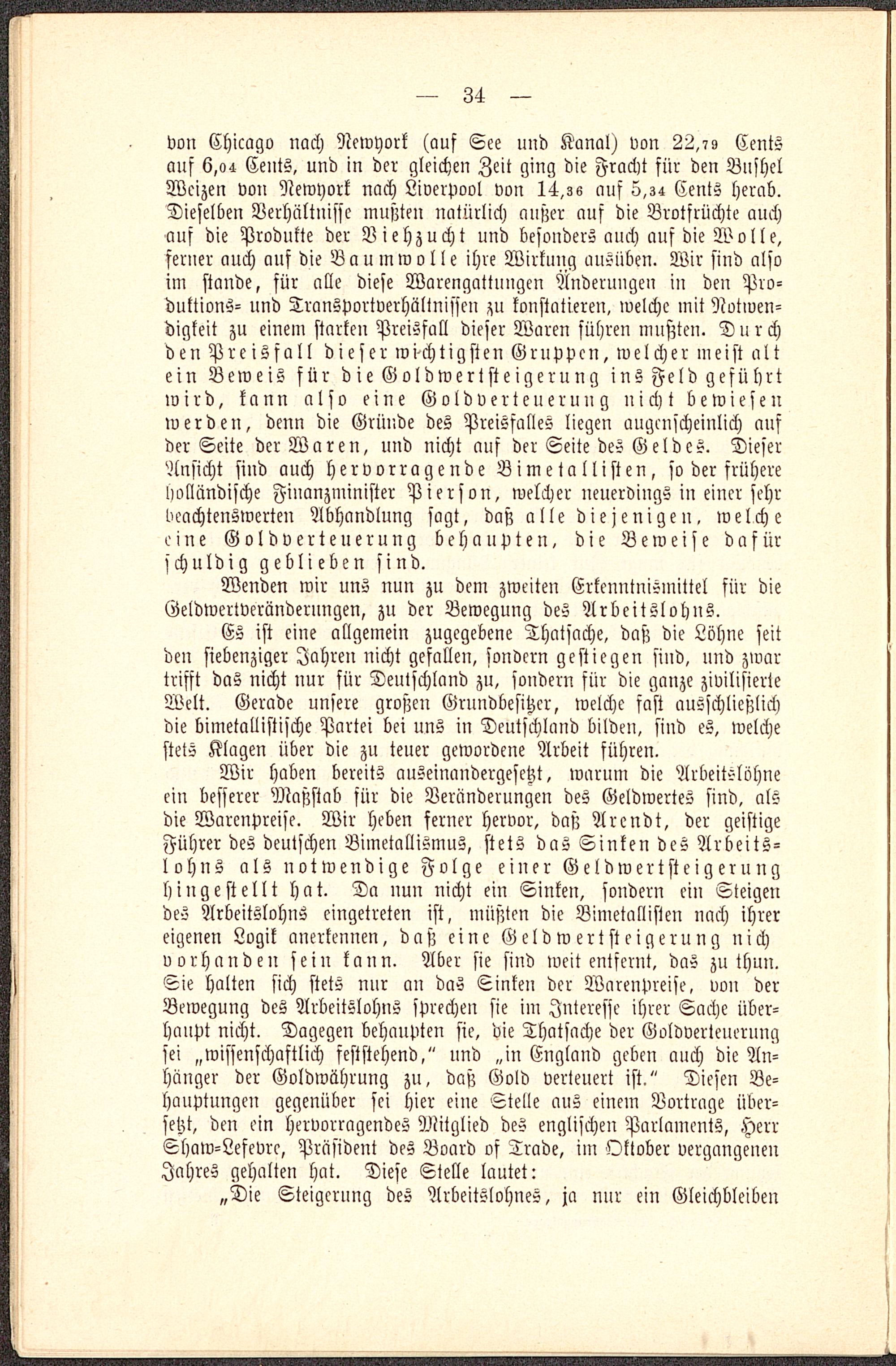 Wir haben bereits auseinandergesetzt, warnm die Arbeitslöhneein besserer Maßstab für die Veränderungen des Geldwertes sind, alsdie Warenpreise. Wir heben ferner hervor, daß Arendt, der geistigeFührer des deutschen Bimetallismus, stets das Sinken des Arbeits-lohns als notwendige Folge einer Geldwertsteigerunghingestellt hat. Da nun nicht ein Sinken, sondern ein Steigendes Arbeitslohns eingetreten ist, müßten die Bimetallisten nach ihrereigenen Logik anerkennen, daß eine Geld Wertsteigerung nichvorhanden sein kann. Aber sie sind weit entfernt, das zu thun.Sie halten sich stets nur an das Sinken der Warenpreise, von derBewegung des Arbeitslohns sprechen sie im Interesse ihrer Sache über-haupt nicht. Dagegen behaupten sie, die Thatsache der Goldverteuerungsei „wissenschaftlich feststehend," und „in England geben auch die An-hänger der Goldwährung zu, daß Gold verteuert ist." Diesen Be-hauptungen gegenüber sei hier eine Stelle aus einem Vortrage über-setzt, den ein hervorragendes Mitglied des englischen Parlaments, HerrShaw-Lefevrc, Präsident des Board of Trade, im Oktober vergangenenJahres gehalten hat. Diese Stelle lautet: