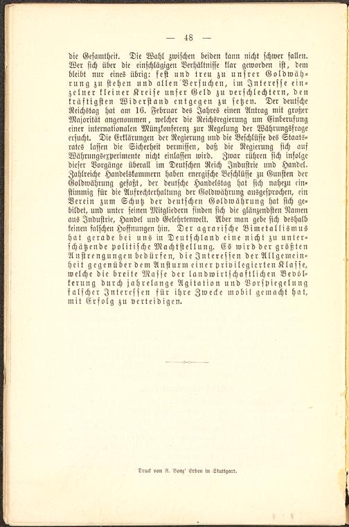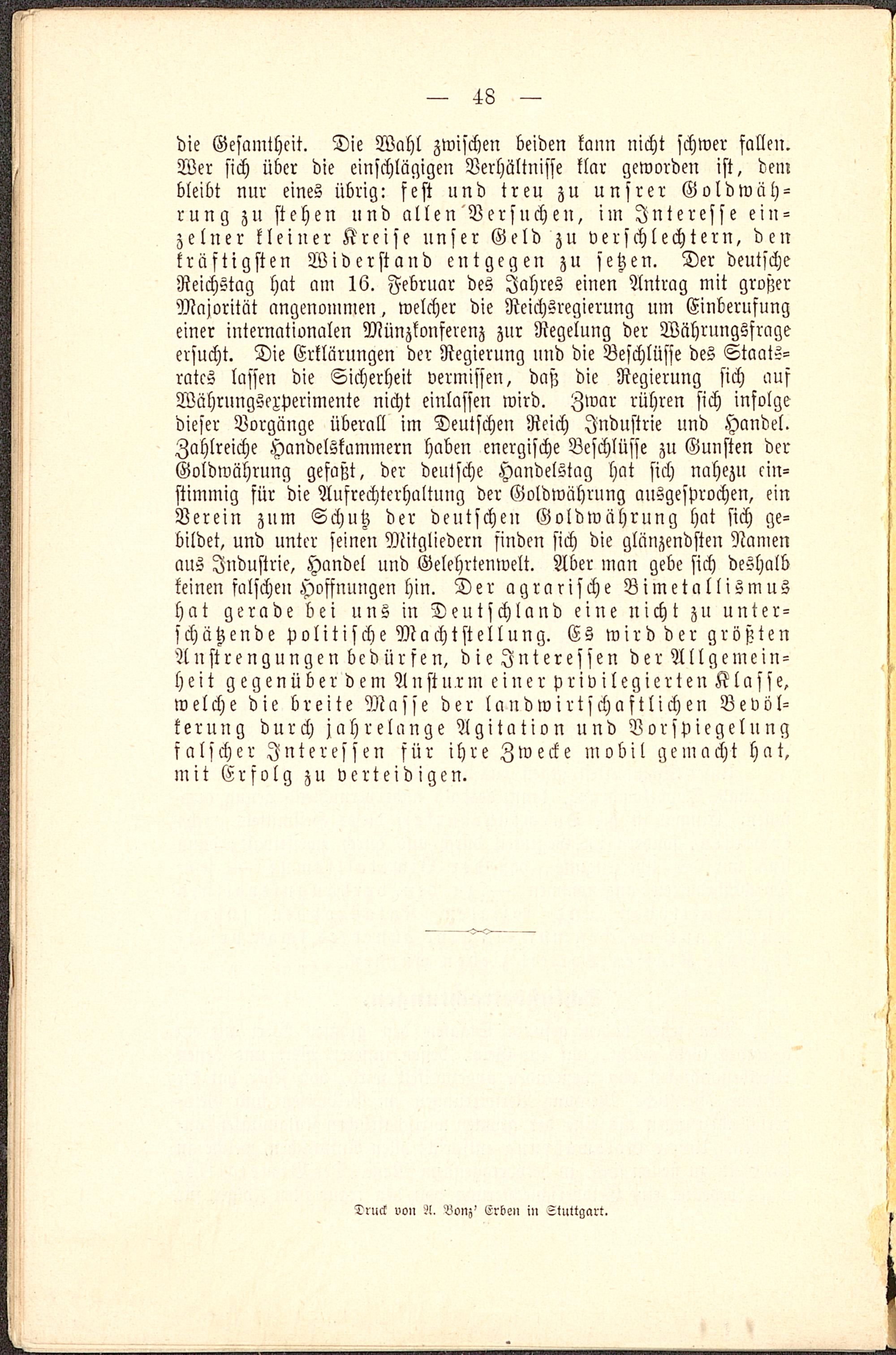 die Gesamtheit. Die Wahl zwischen beiden kann nicht schwer fallen.Wer sich über die einschlägigen Verhältnisse klar geworden ist, dembleibt nur eines übrig: fest und treu zu unsrer Goldwäh-rung zu stehen und allen Versuchen, im Interesse ein-zelner kleiner Kreise unser Geld zu verschlechtern, denkräftigsten Widerstand entgegen zu setzen. Der deutscheReichstag hat am 16. Februar des Jahres einen Antrag mit großerMajorität angenommen, welcher die Reichsregierung nm Einberufungeiner internationalen Münzkonfereuz zur Regelung der Währuugsfrageersucht. Die Erklärungen der Regierung und die Beschlüsse des Staats-rates lassen die Sicherheit vermissen, daß die Regierung sich ausWührungsexperimente nicht einlassen wird. Zwar rühren sich infolgedieser Vorgänge überall im Deutschen Reich Industrie und Handel.Zahlreiche Handelskammern haben energische Beschlüsse zu Gunsten derGoldwährung gefaßt, der deutsche Handelstag hat sich nahezu ein-stimmig für die Aufrechterhaltuug der Goldwährung ausgesprochen, einVerein znm Schutz der deutschen Goldwährung hat sich ge-bildet, und unter seinen Mitgliedern finden sich die glänzendsten Namenaus Industrie, Handel und Gelehrtenwelt. Aber man gebe sich deshalbkeinen falsche» Hoffnungen hin. Der agrarische Bimetallismushat gerade bei uns in Deutschland eine nicht zu unter-schätzende politische Machtstellung. Es wird der größtenAnstrengungen bedürfen, die Interessen der Allgemein-heit gegenüber dem Ansturm einer privilegierten Klasse,welche die breite Masse der laudwirtschaftlichen Bevöl-kerung durch jahrelange Agitation und Vorspiegelungfalscher Interessen für ihre Zwecke mobil gemacht hat,mit Erfolg zu verteidigen.