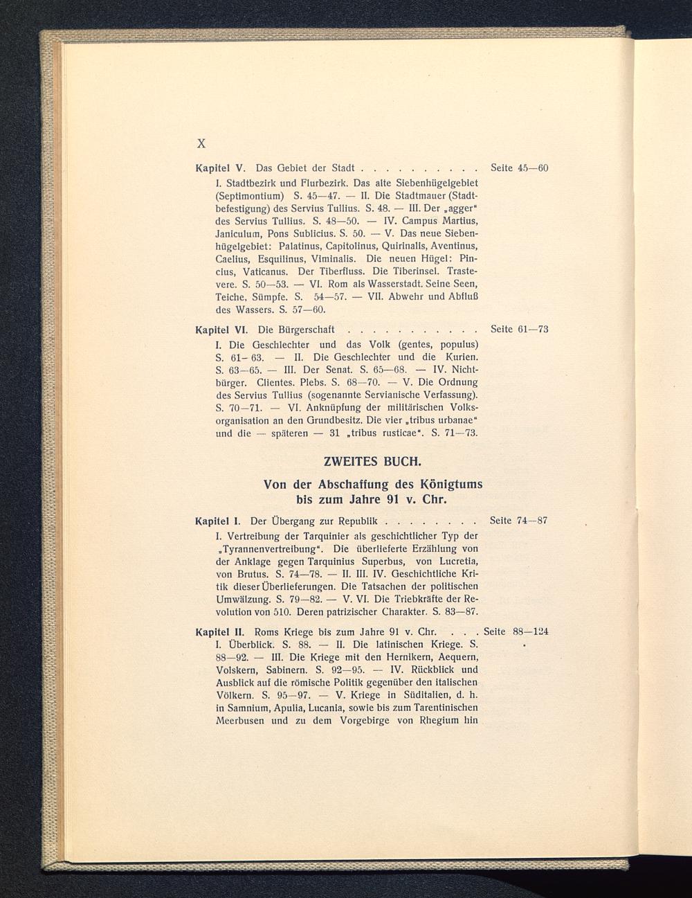 I. Stadtbezirk und Flurbezirk. Das alte Siebenhügelgebiet(Septimontium) S. 45—47. — II. Die Stadtmauer (Stadt-befestigung) des Servius Tullius. S. 48. — III. Der „agger “des Servius Tullius. S. 48—50. — IV. Campus Martius ,