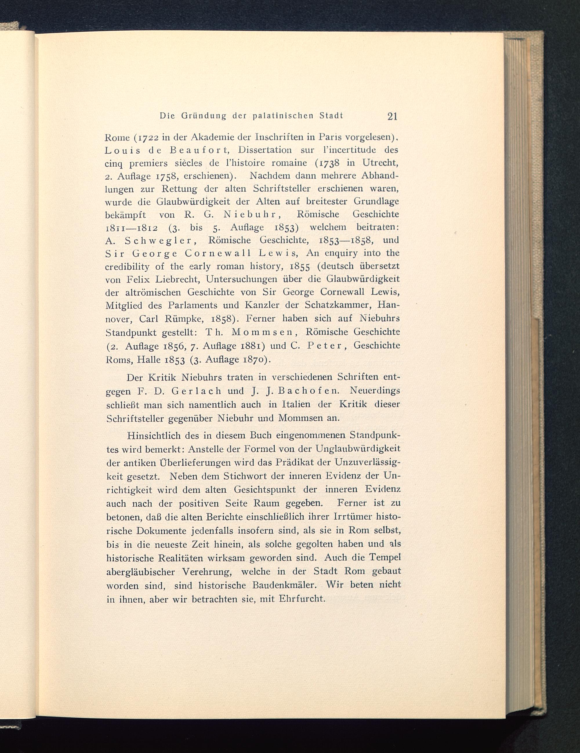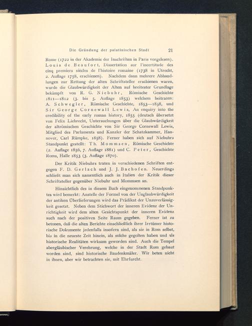 Rome (1722 in der Akademie der Inschriften in Paris vorgelesen),Louis de Beaufort, Dissertation sur l’incertitude descinq premiers siecles de l’histoire romaine (1738 in Utrecht, 2. Auflage 1758, erschienen). Nachdem dann mehrere Abhand-lungen zur Rettung der alten Schriftsteller erschienen waren,wurde die Glaubwürdigkeit der Alten auf breitester Grundlagebekämpft von R. G. N i e b u h r , Römische Geschichte1811—1812 (3. bis 5. Auflage 1853) welchem beitraten:
