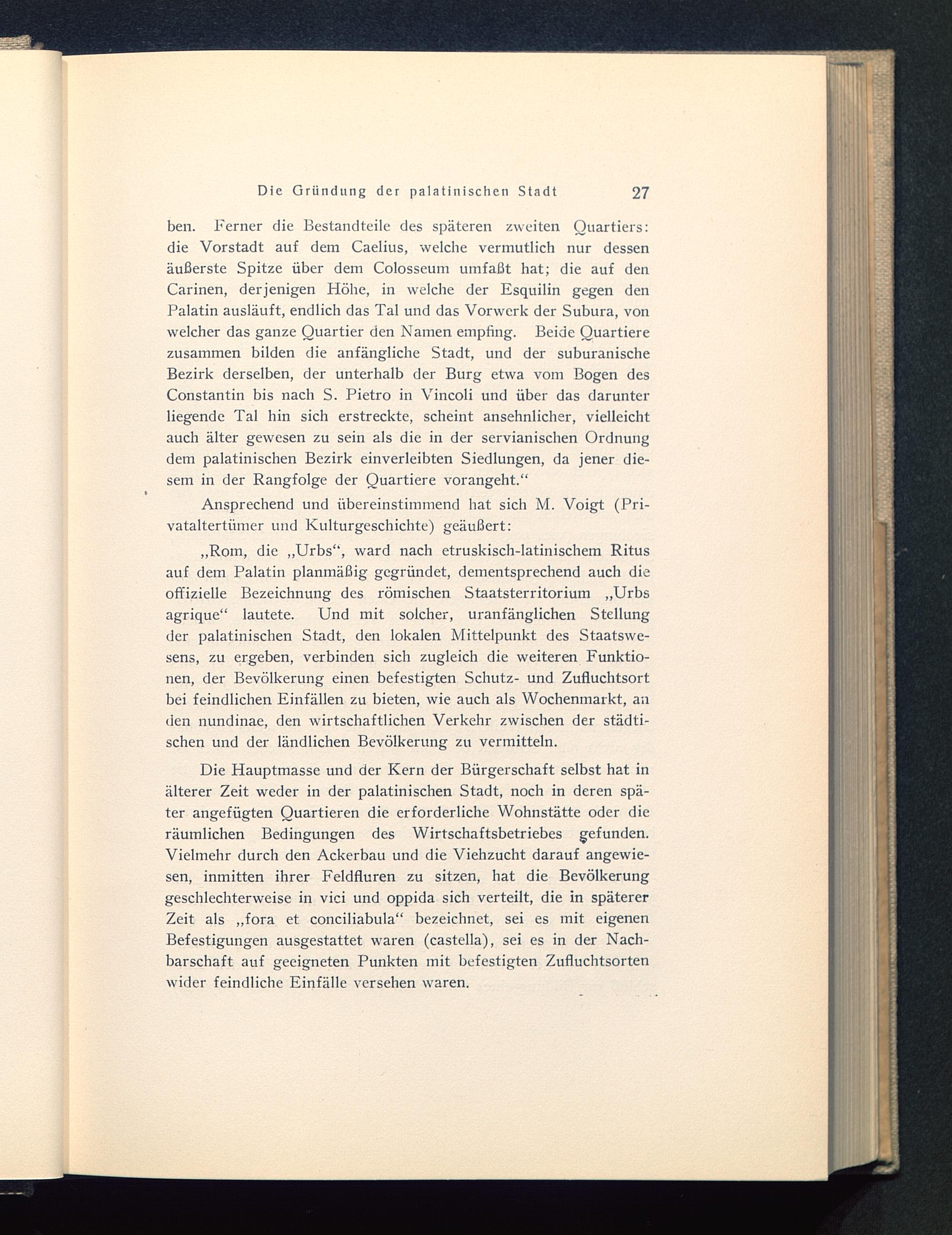 Die Hauptmasse und der Kern der Bürgerschaft selbst hat inälterer Zeit weder in der palatinischen Stadt, noch in deren spä-ter angefügten Quartieren die erforderliche Wohnstätte oder dieräumlichen Bedingungen des Wirtschaftsbetriebes gefunden.Vielmehr durch den Ackerbau und die Viehzucht darauf angewie-sen, inmitten ihrer Feldfluren zu sitzen, hat die Bevölkerunggeschlechterweise in vici und oppida sich verteilt, die in spätererZeit als „fora et conciliabula“ bezeichnet, sei es mit eigenenBefestigungen ausgestattet waren (castella), sei es in der Nach-barschaft auf geeigneten Punkten mit befestigten Zufluchtsortenwider feindliche Einfälle versehen waren.