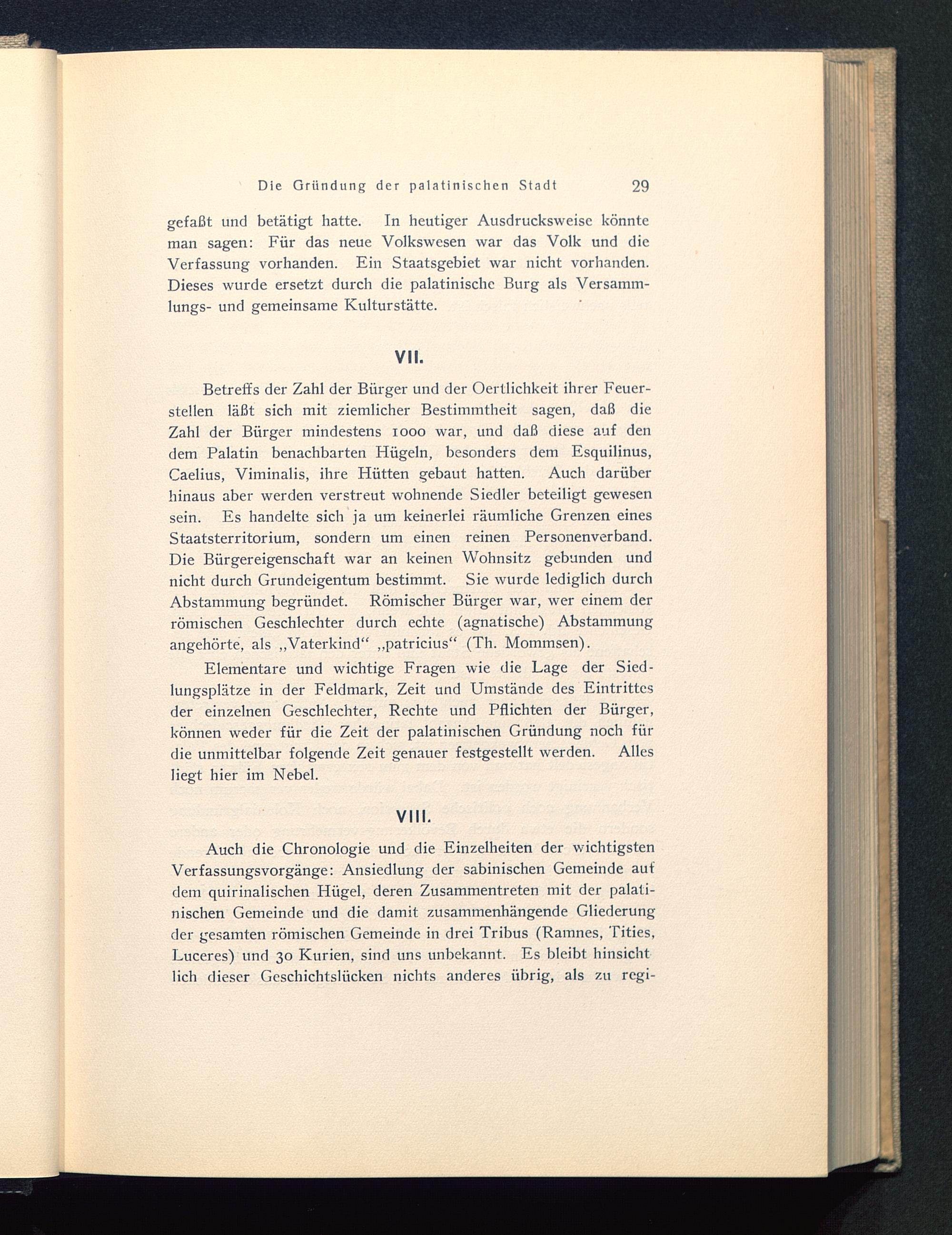 Auch die Chronologie und die Einzelheiten der wichtigstenVerfassungsvorgänge: Ansiedlung der sabinischen Gemeinde aufdem quirinalischen Hügel, deren Zusammentreten mit der palati-nischen Gemeinde und die damit zusammenhängende Gliederungder gesamten römischen Gemeinde in drei Tribus (Ramnes, Tities,Luceres) und 30 Kurien, sind uns unbekannt. Es bleibt hinsicht-lich dieser Geschichtslücken nichts anderes übrig, als zu regi-