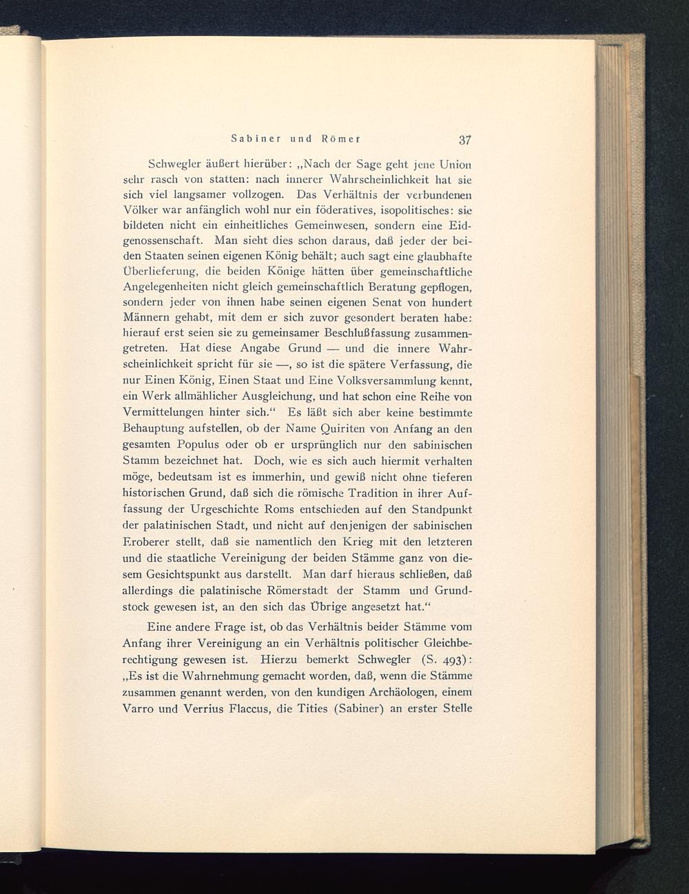 Eine andere Frage ist, ob das Verhältnis beider Stämme vomAnfang ihrer Vereinigung an ein Verhältnis politischer Gleichbe-rechtigung gewesen ist. Hierzu bemerkt Schwegler (S. 493):„Es ist die Wahrnehmung gemacht worden, daß, wenn die Stämmezusammen genannt werden, von den kundigen Archäologen, einemVarro und Verrius Flaccus, die Tities (Sabiner) an erster Stelle
