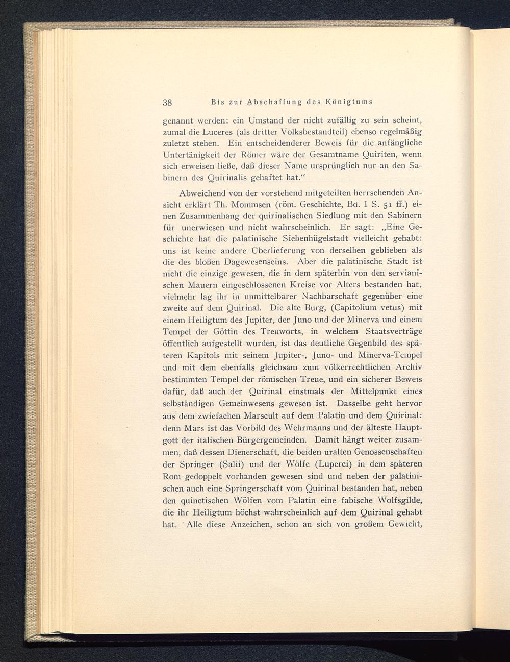Abweichend von der vorstehend mitgeteilten herrschenden An-sicht erklärt Th. Mommsen (röm. Geschichte, Bd. I S. 51 ff.) ei-nen Zusammenhang der quirinalischen Siedlung mit den Sabinernfür unerwiesen und nicht wahrscheinlich. Er sagt: „Eine Ge-schichte hat die palatinische Siebenhügelstadt vielleicht gehabt:uns ist keine andere Überlieferung von derselben geblieben alsdie des bloßen Dagewesenseins. Aber die palatinische Stadt istnicht die einzige gewesen, die in dem späterhin von den serviani-schen Mauern eingeschlossenen Kreise vor Alters bestanden hat,vielmehr lag ihr in unmittelbarer Nachbarschaft gegenüber einezweite auf dem Quirinal . Die alte Burg, (Capitolium vetus) miteinem Heiligtum des Jupiter, der Juno und der Minerva und einemTempel der Göttin des Treuworts, in welchem Staatsverträgeöffentlich aufgestellt wurden, ist das deutliche Gegenbild des spä-teren Kapitols mit seinem Jupiter-, Juno- und Minerva-Tempelund mit dem ebenfalls gleichsam zum völkerrechtlichen Archivbestimmten Tempel der römischen Treue, und ein sicherer Beweisdafür, daß auch der Quirinal einstmals der Mittelpunkt einesselbständigen Gemeinwesens gewesen ist. Dasselbe geht hervoraus dem zwiefachen Marscult auf dem Palatin und dem Quirinal :denn Mars ist das Vorbild des Wehrmanns und der älteste Haupt-gott der italischen Bürgergemeinden. Damit hängt weiter zusam-men, daß dessen Dienerschaft, die beiden uralten Genossenschaftender Springer (Salii) und der Wölfe (Luperci) in dem späterenRom gedoppelt vorhanden gewesen sind und neben der palatini-schen auch eine Springerschaft vom Quirinal bestanden hat, nebenden quinctischen Wölfen vom Palatin eine fabische Wolfsgilde,die ihr Heiligtum höchst wahrscheinlich auf dem Quirinal gehabthat. Alle diese Anzeichen, schon an sich von großem Gewicht,