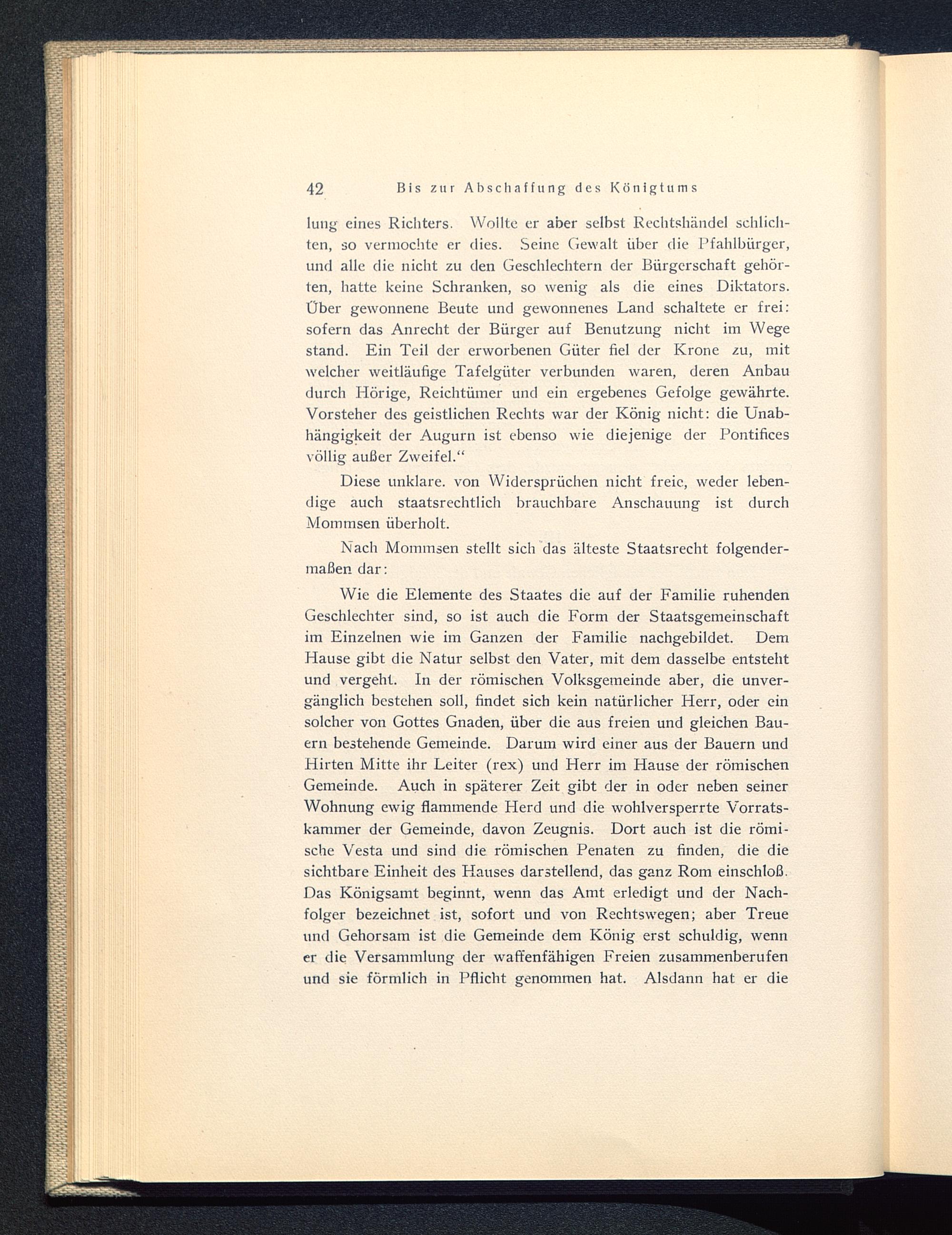 Wie die Elemente des Staates die auf der Familie ruhendenGeschlechter sind, so ist auch die Form der Staatsgemeinschaftim Einzelnen wie im Ganzen der Familie nachgebildet. DemHause gibt die Natur selbst den Vater, mit dem dasselbe entstehtund vergeht. In der römischen Volksgemeinde aber, die unver-gänglich bestehen soll, findet sich kein natürlicher Herr, oder einsolcher von Gottes Gnaden, über die aus freien und gleichen Bau-ern bestehende Gemeinde. Darum wird einer aus der Bauern undHirten Mitte ihr Leiter (rex) und Herr im Hause der römischenGemeinde. Auch in späterer Zeit gibt der in oder neben seinerWohnung ewig flammende Herd und die wohlversperrte Vorrats-kammer der Gemeinde, davon Zeugnis. Dort auch ist die römi-sche Vesta und sind die römischen Penaten zu finden, die diesichtbare Einheit des Hauses darstellend, das ganz Rom einschloß.Das Königsamt beginnt, wenn das Amt erledigt und der Nach-folger bezeichnet ist, sofort und von Rechtswegen; aber Treueund Gehorsam ist die Gemeinde dem König erst schuldig, wenner die Versammlung der waffenfähigen Freien zusammenberufenund sie förmlich in Pflicht genommen hat. Alsdann hat er die
