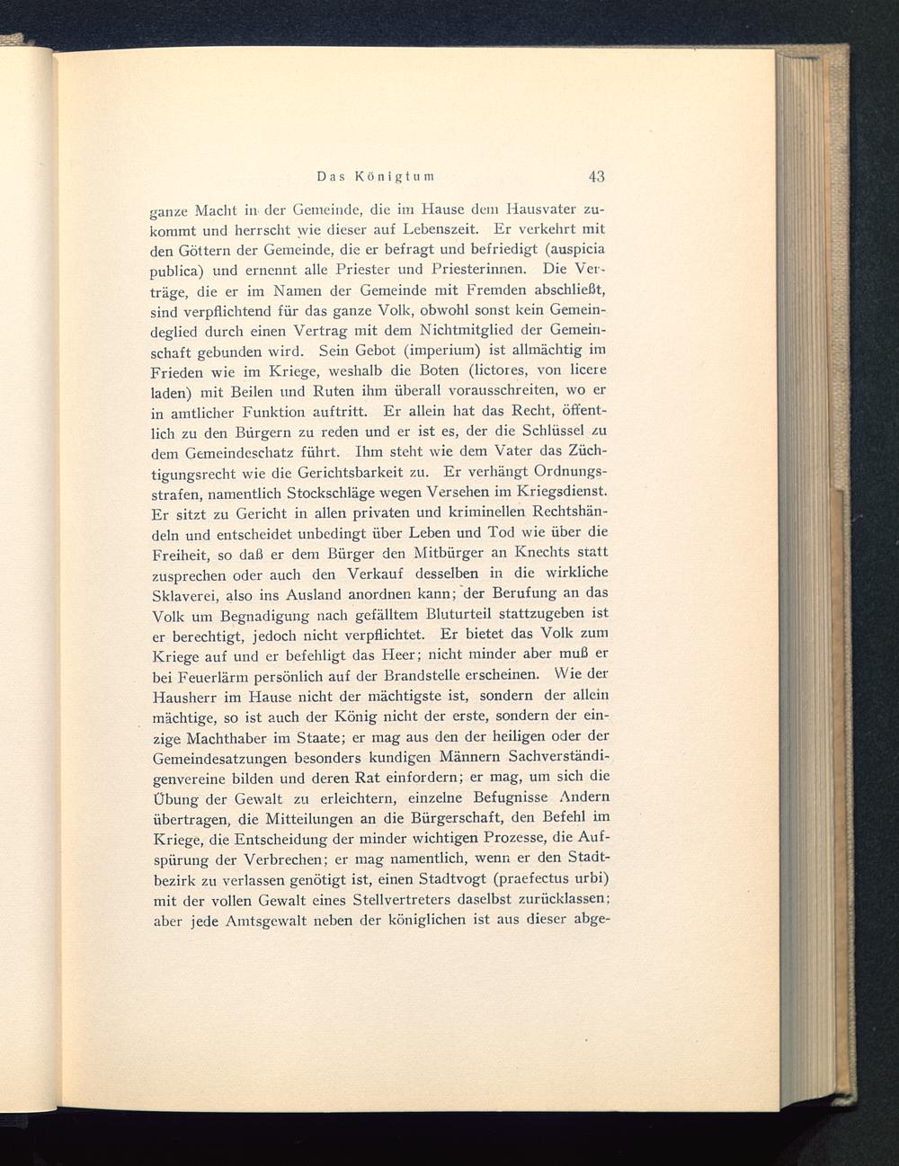 ganze Macht in der Gemeinde, die im Hause dem Hausvater zu-kommt und herrscht wie dieser auf Lebenszeit. Er verkehrt mitden Göttern der Gemeinde, die er befragt und befriedigt (auspiciapublica) und ernennt alle Priester und Priester innen. Die Ver-träge, die er im Namen der Gemeinde mit Fremden abschließt,sind verpflichtend für das ganze Volk, obwohl sonst kein Gemein-deglied durch einen Vertrag mit dem Nichtmitglied der Gemein-schaft gebunden wird. Sein Gebot (imperium) ist allmächtig imFrieden wie im Kriege, weshalb die Boten (lictores, von Heereladen) mit Beilen und Ruten ihm überall vorausschreiten, wo erin amtlicher Funktion auf tritt. Er allein hat das Recht, öffent-lich zu den Bürgern zu reden und er ist es, der die Schlüssel zudem Gemeindeschatz führt. Ihm steht wie dem Vater das Züch-tigungsrecht wie die Gerichtsbarkeit zu. Er verhängt Ordnungs-strafen, namentlich Stockschläge wegen Versehen im Kriegsdienst.Er sitzt zu Gericht in allen privaten und kriminellen Rechtshän-deln und entscheidet unbedingt über Leben und Tod wie über dieFreiheit, so daß er dem Bürger den Mitbürger an Knechts stattzusprechen oder auch den Verkauf desselben in die wirklicheSklaverei, also ins Ausland anordnen kann; der Berufung an dasVolk um Begnadigung nach gefälltem Bluturteil stattzugeben ister berechtigt, jedoch nicht verpflichtet. Er bietet das Volk zumKriege auf und er befehligt das Heer; nicht minder aber muß erbei Feuerlärm persönlich auf der Brandstelle erscheinen. Wie derHausherr im Hause nicht der mächtigste ist, sondern der alleinmächtige, so ist auch der König nicht der erste, sondern der ein-zige Machthaber im Staate; er mag aus den der heiligen oder derGemeindesatzungen besonders kundigen Männern Sachverständi-genvereine bilden und deren Rat einfordern; er mag, um sich dieÜbung der Gewalt zu erleichtern, einzelne Befugnisse Andernübertragen, die Mitteilungen an die Bürgerschaft, den Befehl imKriege, die Entscheidung der minder wichtigen Prozesse, die Auf-spürung der Verbrechen; er mag namentlich, wenn er den Stadt-bezirk zu verlassen genötigt ist, einen Stadtvogt (praefectus urbi)mit der vollen Gewalt eines Stellvertreters daselbst zurücklassen;aber jede Amtsgewalt neben der königlichen ist aus dieser abge-