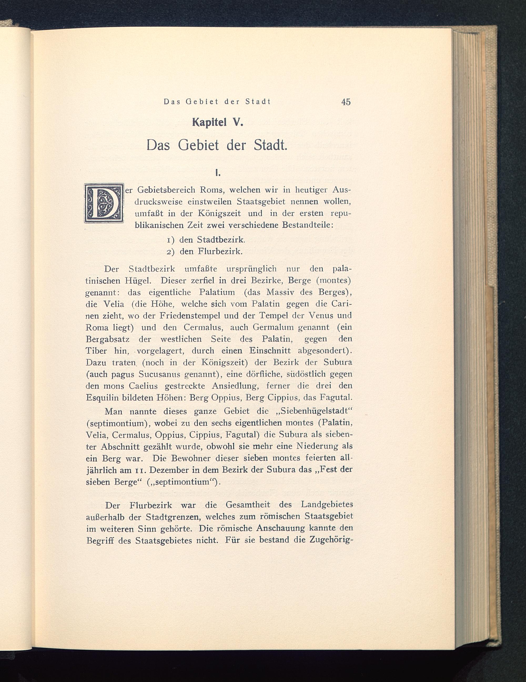 Der Stadtbezirk umfaßte ursprünglich nur den pala-tinischen Hügel. Dieser zerfiel in drei Bezirke, Berge (montes)genannt: das eigentliche Palatium (das Massiv des Berges),die Velia (die Höhe, welche sich vom Palatin gegen die Cari-nen zieht, wo der Friedenstempel und der Tempel der Venus undRoma liegt) und den Cermalus, auch Germalum genannt (einBergabsatz der westlichen Seite des Palatin , gegen denTiber hin, vorgelagert, durch einen Einschnitt abgesondert).Dazu traten (noch in der Königszeit) der Bezirk der Subura (auch pagus Sucusanus genannt), eine dörfliche, südöstlich gegenden mons Caelius gestreckte Ansiedlung, ferner die drei denEsquilin bildeten Höhen: Berg Oppius, Berg Cippius, das Fagutal.