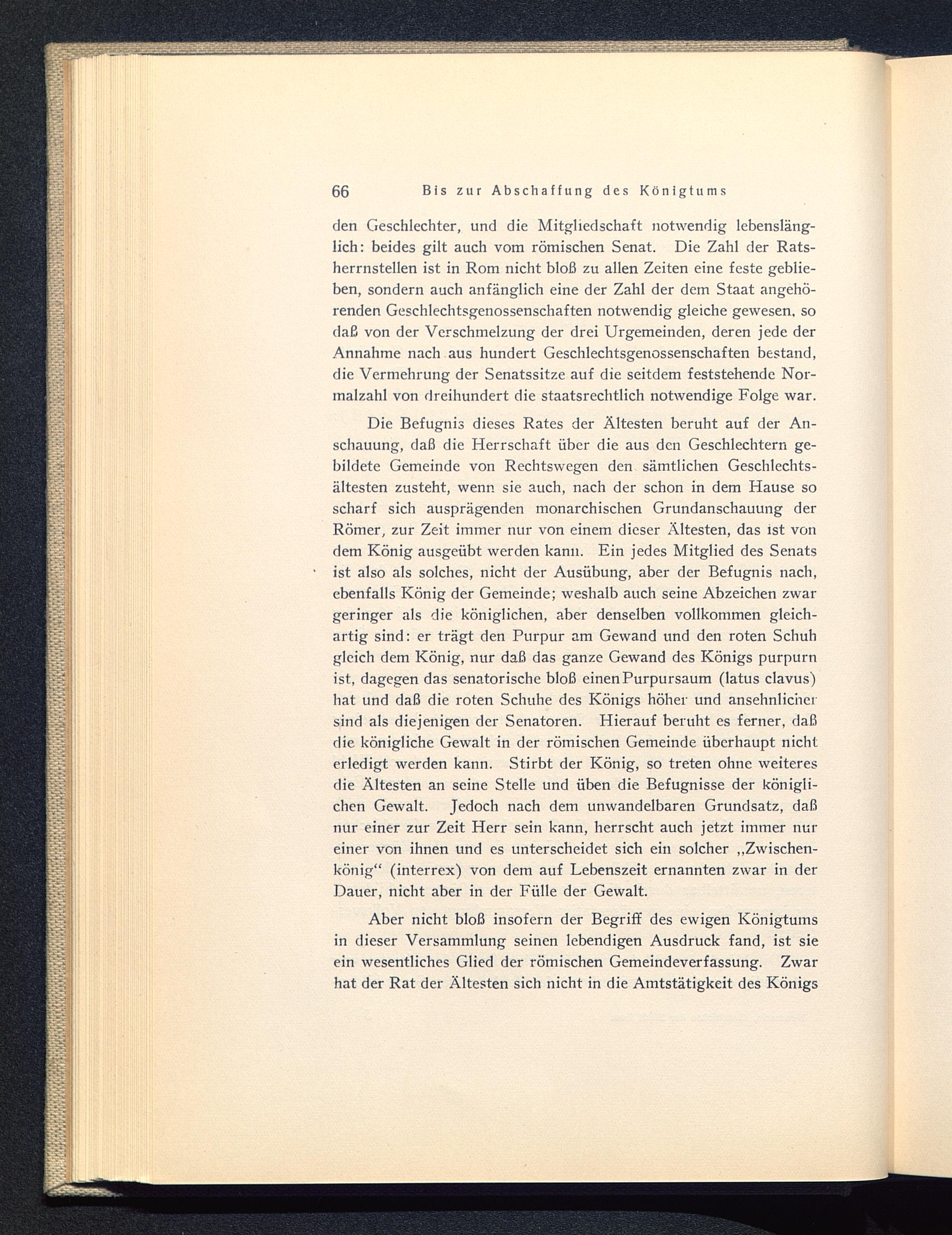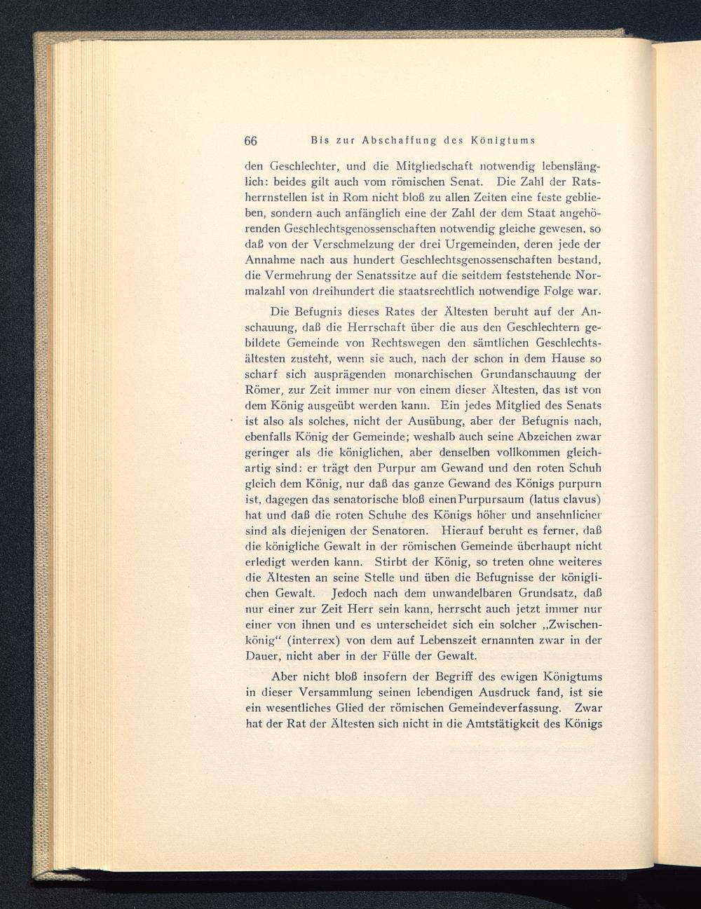 Die Befugnis dieses Rates der Ältesten beruht auf der An-schauung, daß die Herrschaft über die aus den Geschlechtern ge-bildete Gemeinde von Rechtswegen den sämtlichen Geschlechts-ältesten zusteht, wenn sie auch, nach der schon in dem Hause soscharf sich ausprägenden monarchischen Grundanschauung derRömer, zur Zeit immer nur von einem dieser Ältesten, das ist vondem König ausgeübt werden kann. Ein jedes Mitglied des Senatsist also als solches, nicht der Ausübung, aber der Befugnis nach,ebenfalls König der Gemeinde; weshalb auch seine Abzeichen zwargeringer als die königlichen, aber denselben vollkommen gleich-artig sind: er trägt den Purpur am Gewand und den roten Schuhgleich dem König, nur daß das ganze Gewand des Königs purpurnist, dagegen das senatorische bloß einen Purpursaum (latus clavus)hat und daß die roten Schuhe des Königs höher und ansehnlichersind als diejenigen der Senatoren. Hierauf beruht es ferner, daßdie königliche Gewalt in der römischen Gemeinde überhaupt nichterledigt werden kann. Stirbt der König, so treten ohne weiteresdie Ältesten an seine Stelle und üben die Befugnisse der königli-chen Gewalt. Jedoch nach dem unwandelbaren Grundsatz, daßnur einer zur Zeit Herr sein kann, herrscht auch jetzt immer nureiner von ihnen und es unterscheidet sich ein solcher „Zwischen-könig“ (interrex) von dem auf Lebenszeit ernannten zwar in derDauer, nicht aber in der Fülle der Gewalt.