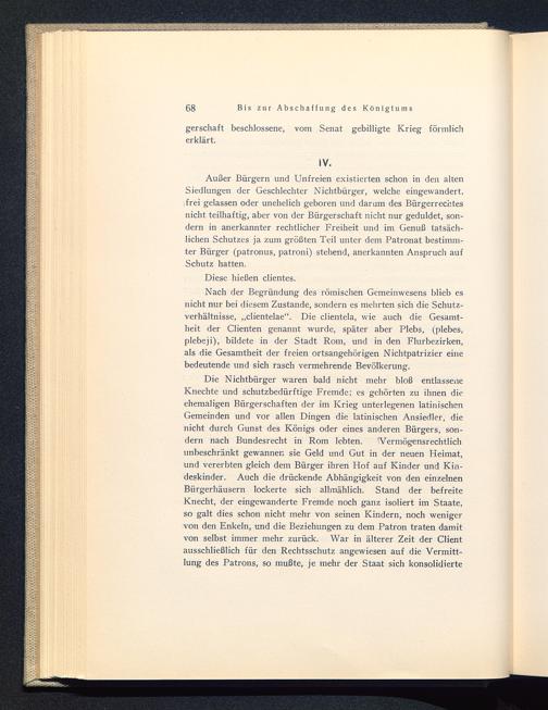 Nach der Begründung des römischen Gemeinwesens blieb esnicht nur bei diesem Zustande, sondern es mehrten sich die Schutz-verhältnisse, „clientelae“. Die clientela, wie auch die Gesamt-heit der Clienten genannt wurde, später aber Plebs, (plebes,plebeji), bildete in der Stadt Rom , und in den Flurbezirken,als die Gesamtheit der freien Ortsangehörigen Nichtpatrizier einebedeutende und sich rasch vermehrende Bevölkerung.