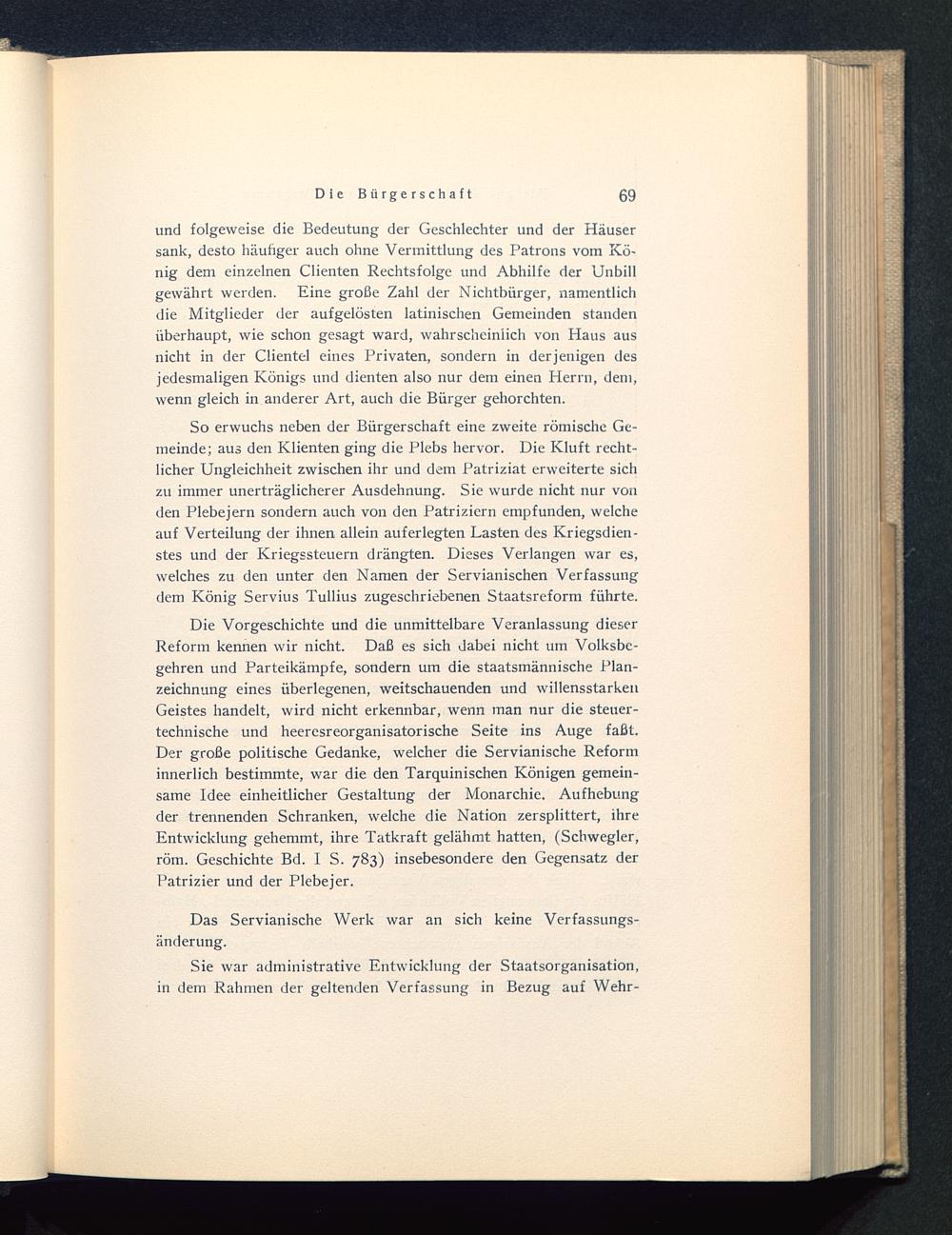 So erwuchs neben der Bürgerschaft eine zweite römische Ge-meinde; aus den Klienten ging die Plebs hervor. Die Kluft recht-licher Ungleichheit zwischen ihr und dem Patriziat erweiterte sichzu immer unerträglicherer Ausdehnung. Sie wurde nicht nur vonden Plebejern sondern auch von den Patriziern empfunden, welcheauf Verteilung der ihnen allein auferlegten Lasten des Kriegsdien-stes und der Kriegssteuern drängten. Dieses Verlangen war es,welches zu den unter den Namen der Servianischen Verfassungdem König Servius Tullius zugeschriebenen Staatsreform führte.