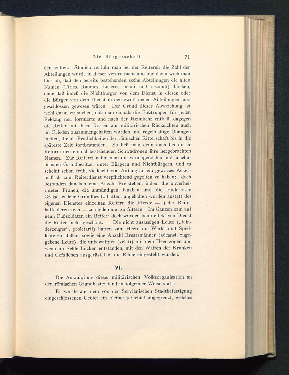 den sollten. Ähnlich verfuhr man bei der Reiterei: die Zahl derAbteilungen wurde in dieser verdreifacht und nur darin wich manhier ab, daß den bereits bestehenden sechs Abteilungen die altenNamen (Tities, Raumes, Luceres primi und secundi) blieben,ohne daß indeß die Nichtbürger von dem Dienst in diesen oderdie Bürger von dem Dienst in den zwölf neuen Abteilungen aus-geschlossen gewesen wären. Der Grund dieser Abweichung istwohl darin zu suchen, daß man damals die Fußtruppen für jedenFeldzug neu formierte und nach der Heimkehr entließ, dagegendie Reiter mit ihren Rossen aus militärischen Rücksichten auchim Frieden zusammengehalten wurden und regelmäßige Übungenhielten, die als Festlichkeiten der römischen Ritterschaft bis in diespäteste Zeit fortbestanden. So ließ man denn auch bei dieserReform den einmal bestehenden Schwadronen ihre hergebrachtenNamen. Zur Reiterei nahm man die vermögendsten und ansehn-lichsten Grundbesitzer unter Bürgern und Nichtbürgern, und esscheint schon früh, vielleicht von Anfang an ein gewisses Acker-maß als zum Reiterdienst verpflichtend gegolten zu haben; dochbestanden daneben eine Anzahl Freistellen, indem die unverhei-rateten Frauen, die unmündigen Knaben und die kinderlosenGreise, welche Grundbesitz hatten, angehalten wurden anstatt deseigenen Dienstes einzelnen Reitern die Pferde — jeder Reiterhatte deren zwei — zu stellen und zu füttern. Im Ganzen kam aufneun Fußsoldaten ein Reiter; doch wurden beim effektiven Dienstdie Reiter mehr geschont. — Die nicht ansässigen Leute („Kin-derzeuger“, proletarii) hatten zum Heere die Werk- und Spiel-leute zu stellen, sowie eine Anzahl Ersatzmänner (adeensi, zuge-gebene Leute), die unbewaffnet (velati) mit dem Heer zogen undwenn im Felde Lücken entstanden, mit den Waffen der Krankenund Gefallenen ausgerüstet in die Reihe eingestellt wurden.