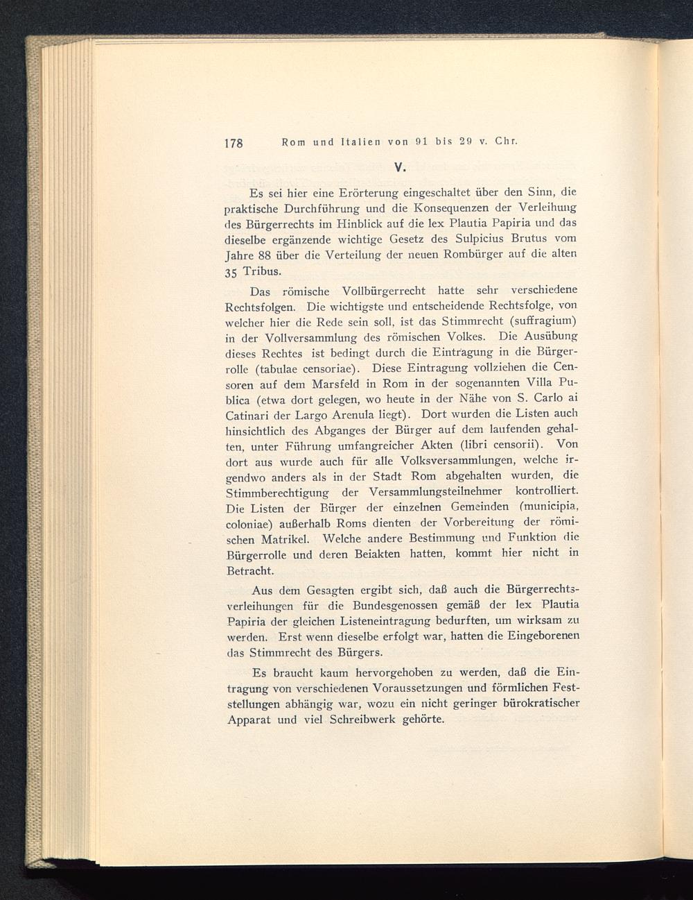 Es sei hier eine Erörterung eingeschaltet über den Sinn, diepraktische Durchführung und die Konsequenzen der Verleihungdes Bürgerrechts im Hinblick auf die lex Plautia Papiria und dasdieselbe ergänzende wichtige Gesetz des Sulpicius Brutus vomJahre 88 über die Verteilung der neuen Rombürger auf die alten35 Tribus.