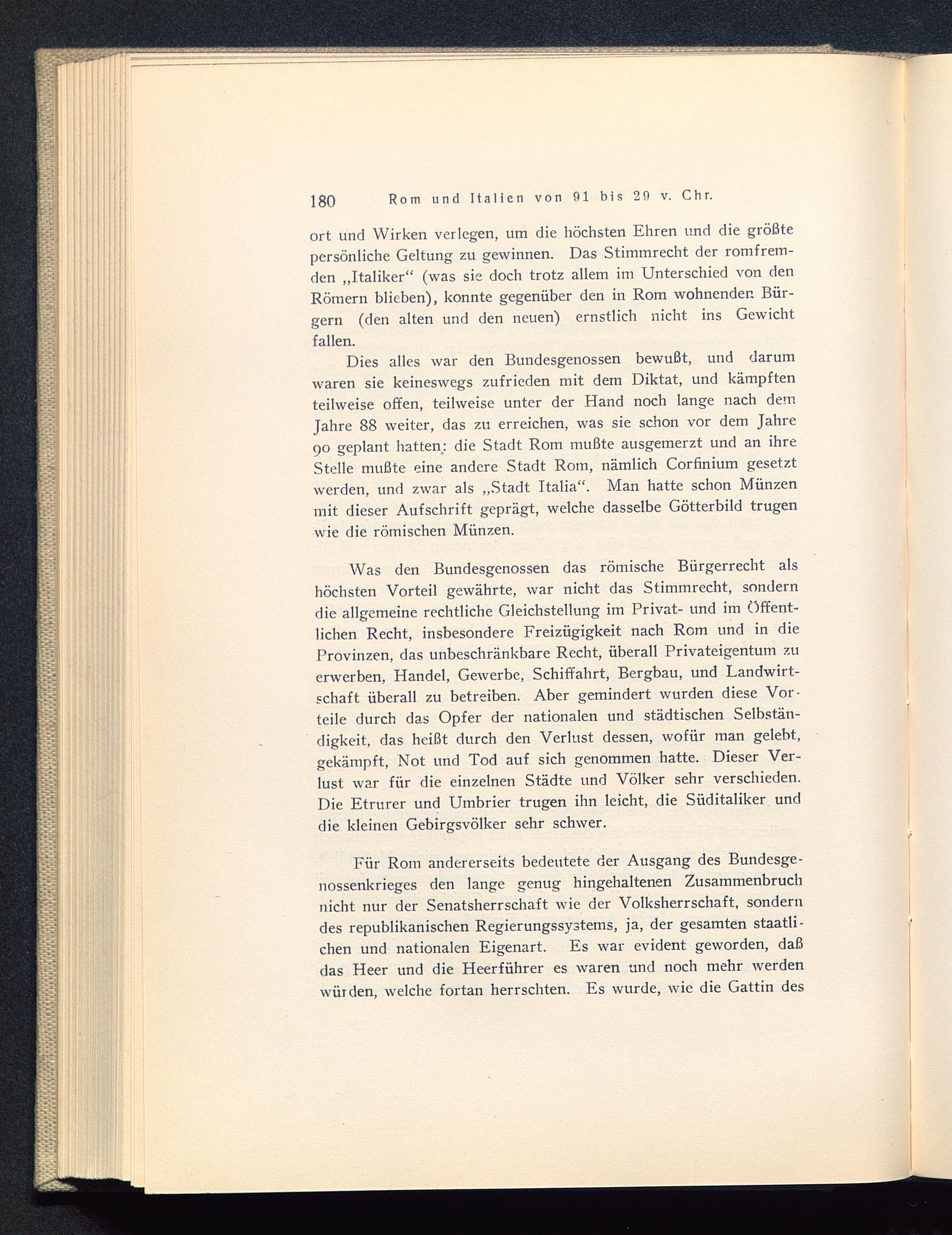 Dies alles war den Bundesgenossen bewußt, und darumwaren sie keineswegs zufrieden mit dem Diktat, und kämpftenteilweise offen, teilweise unter der Hand noch lange nach demJahre 88 weiter, das zu erreichen, was sie schon vor dem Jahre90 geplant hatten: die Stadt Rom mußte ausgemerzt und an ihreStelle mußte eine andere Stadt Rom , nämlich Corfinium gesetztwerden, und zwar als „Stadt Italia “. Man hatte schon Münzenmit dieser Aufschrift geprägt, welche dasselbe Götterbild trugenwie die römischen Münzen.