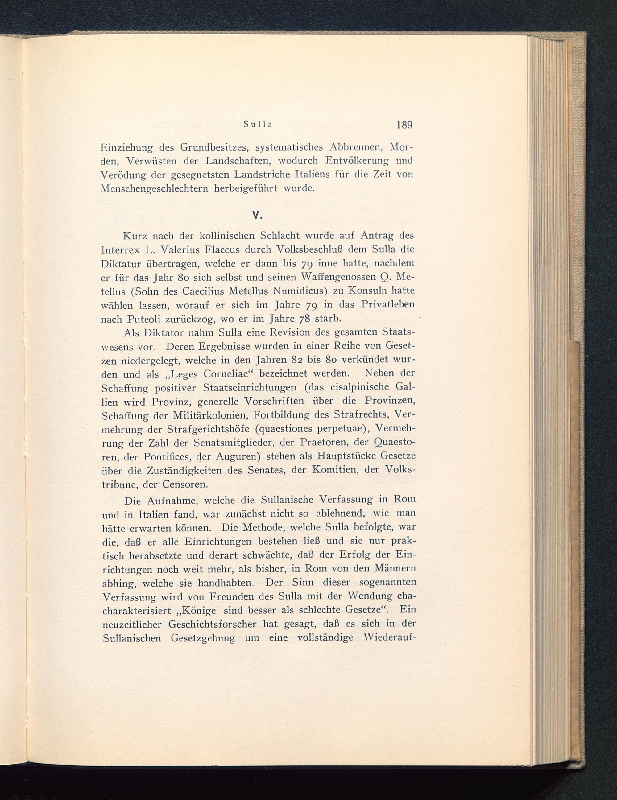 Die Aufnahme, welche die Sullanische Verfassung in Rom und in Italien fand, war zunächst nicht so ablehnend, wie manhätte erwarten können. Die Methode, welche Sulla befolgte, wardie, daß er alle Einrichtungen bestehen ließ und sie nur prak-tisch herabsetzte und derart schwächte, daß der Erfolg der Ein-richtungen noch weit mehr, als bisher, in Rom von den Männernabhing, welche sie handhabten. Der Sinn dieser sogenanntenVerfassung wird von Freunden des Sulla mit der Wendung cha-charakterisiert „Könige sind besser als schlechte Gesetze“. Einneuzeitlicher Geschichtsforscher hat gesagt, daß es sich in derSullanischen Gesetzgebung um eine vollständige Wiederauf-