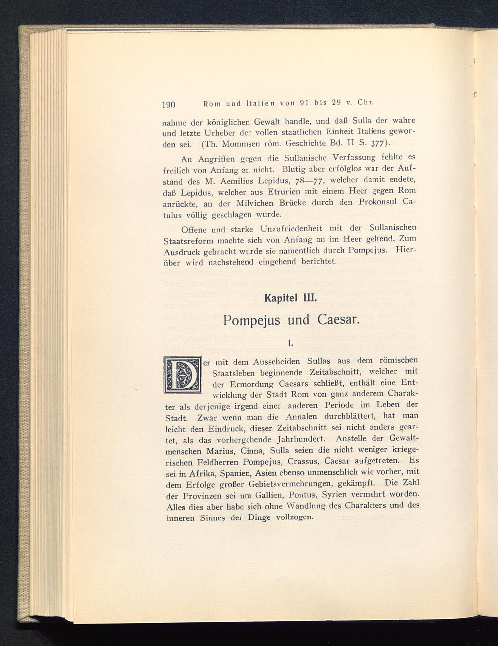 er mit dem Ausscheiden Sullas aus dem römischenStaatsleben beginnende Zeitabschnitt, welcher mitder Ermordung Caesars schließt, enthält eine Ent-wicklung der Stadt Rom von ganz anderem Charak-ter als derjenige irgend einer anderen Periode im Leben derStadt. Zwar wenn man die Annalen durchblättert, hat manleicht den Eindruck, dieser Zeitabschnitt sei nicht anders gear-tet, als das vorhergehende Jahrhundert. Anstelle der Gewalt-menschen Marius, Cinna, Sulla seien die nicht weniger kriege-rischen Feldherren Pompejus, Crassus , Caesar aufgetreten. Essei in Afrika, Spanien, Asien ebenso unmenschlich wie vorher, mitdem Erfolge großer Gebietsvermehrungen, gekämpft. Die Zahlder Provinzen sei um Gallien, Pontus, Syrien vermehrt worden.Alles dies aber habe sich ohne Wandlung des Charakters und desinneren Sinnes der Dinge vollzogen.