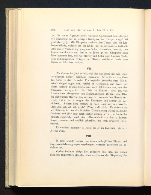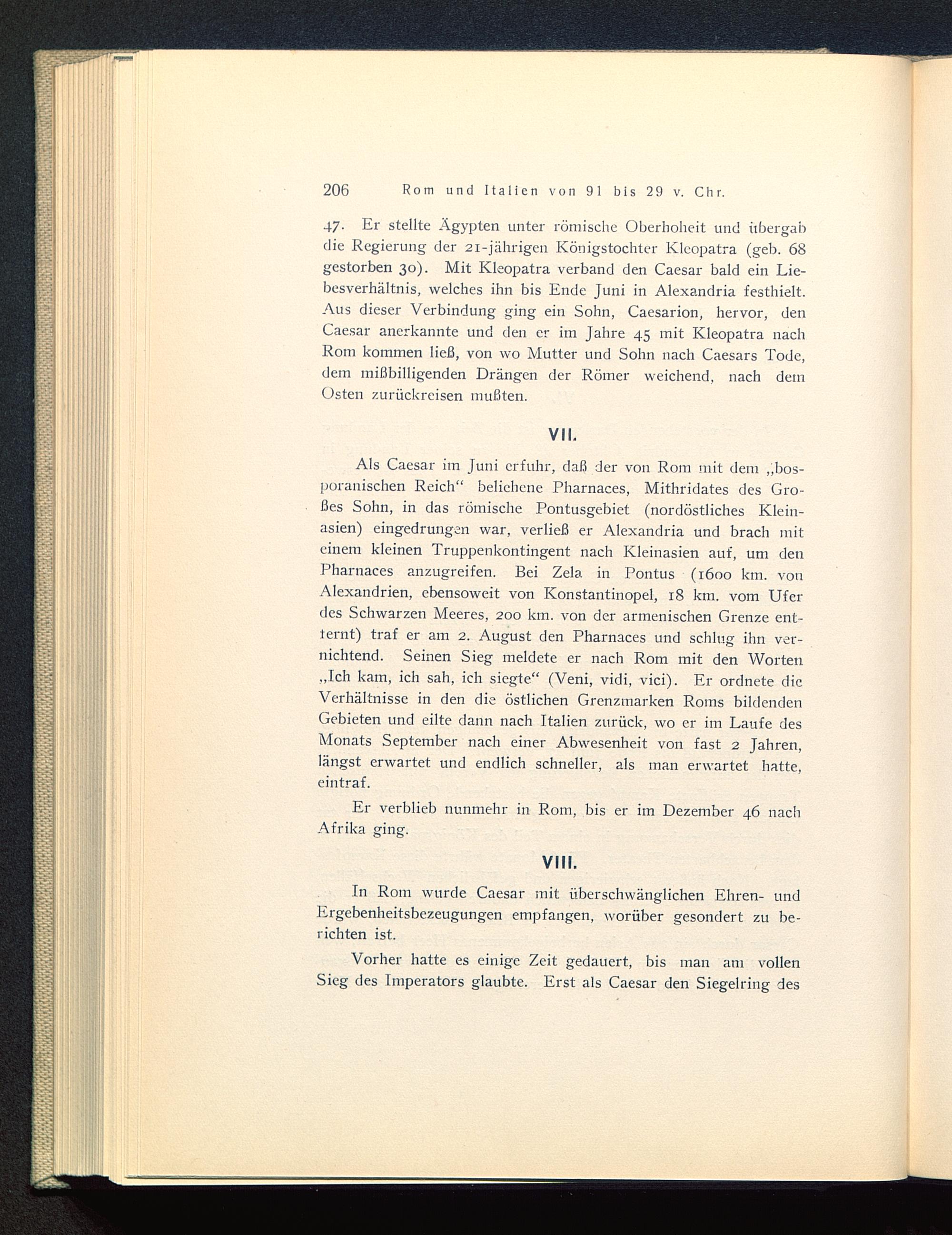 Als Caesar im Juni erfuhr, daß der von Rom mit dem „bos-poranischen Reich“ belichcne Pharnaces, Mithridates des Gro-ßes Sohn, in das römische Pontusgebiet (nordöstliches Klein-asien) eingedrungen war, verließ er Alexandria und brach miteinem kleinen Truppenkontingent nach Kleinasien auf, um denPharnaces anzugreifen. Bei Zela in Pontus (1600 km. vonAlexandrien , ebensoweit von Konstantinopel, 18 km. vom Uferdes Schwarzen Meeres , 200 km. von der armenischen Grenze ent-ternt) traf er am 2. August den Pharnaces und schlug ihn ver-nichtend. Seinen Sieg meldete er nach Rom mit den Worten,,Ich kam, ich sah, ich siegte“ (Veni, vidi, vici). Er ordnete dieVerhältnisse in den die östlichen Grenzmarken Roms bildendenGebieten und eilte dann nach Italien zurück, wo er im Laufe desMonats September nach einer Abwesenheit von fast 2 Jahren,längst erwartet und endlich schneller, als man erwartet hatte,eintraf.