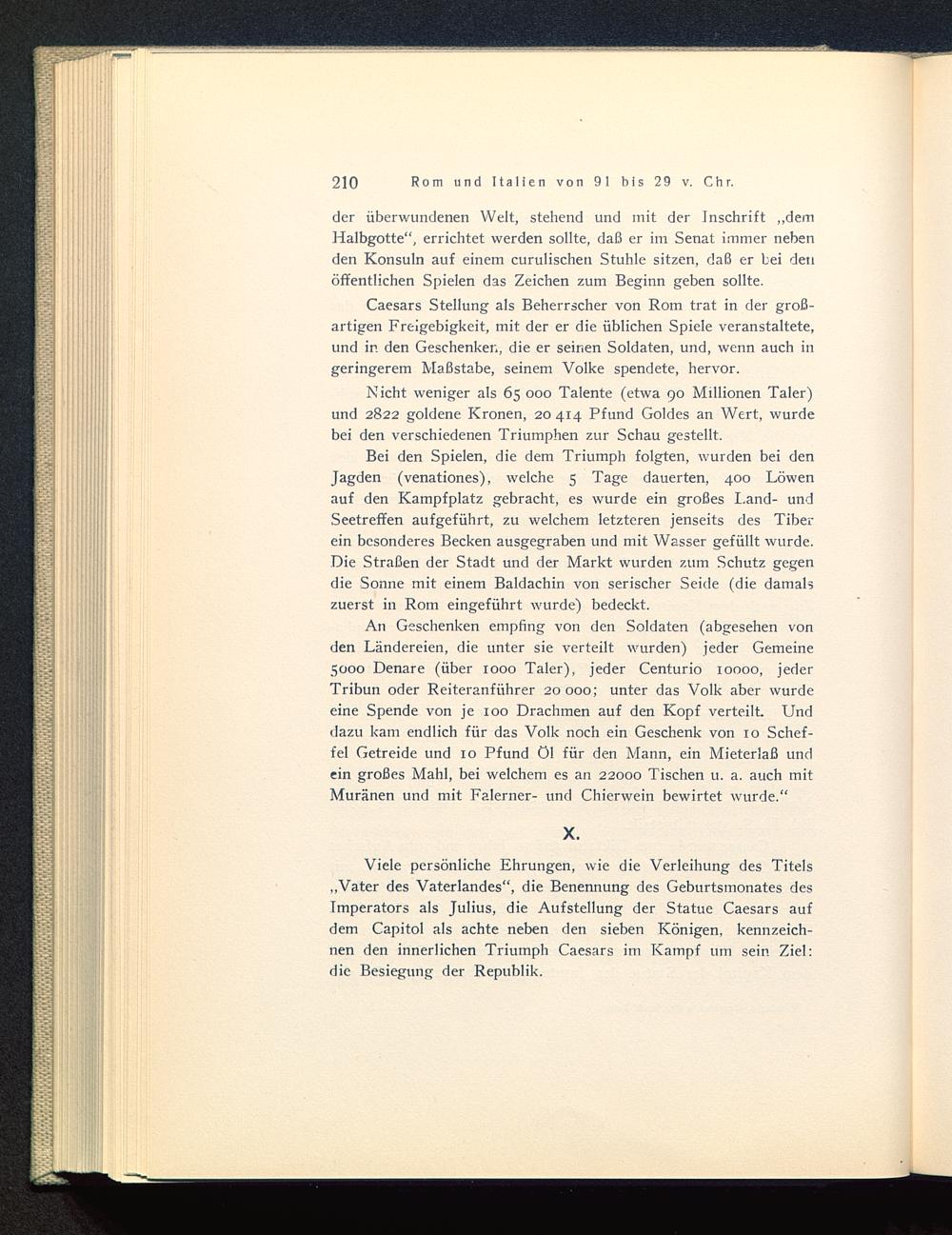 An Geschenken empfing von den Soldaten (abgesehen vonden Ländereien, die unter sie verteilt wurden) jeder Gemeine5000 Denare (über 1000 Taler), jeder Centurio 10000, jederTribun oder Reiteranführer 20000; unter das Volk aber wurdeeine Spende von je 100 Drachmen auf den Kopf verteilt. Unddazu kam endlich für das Volk noch ein Geschenk von 10 Schef-fel Getreide und 10 Pfund öl für den Mann, ein Mieterlaß undein großes Mahl, bei welchem es an 22000 Tischen u. a. auch mitMuränen und mit Falerner- und Chierwein bewirtet wurde.“
