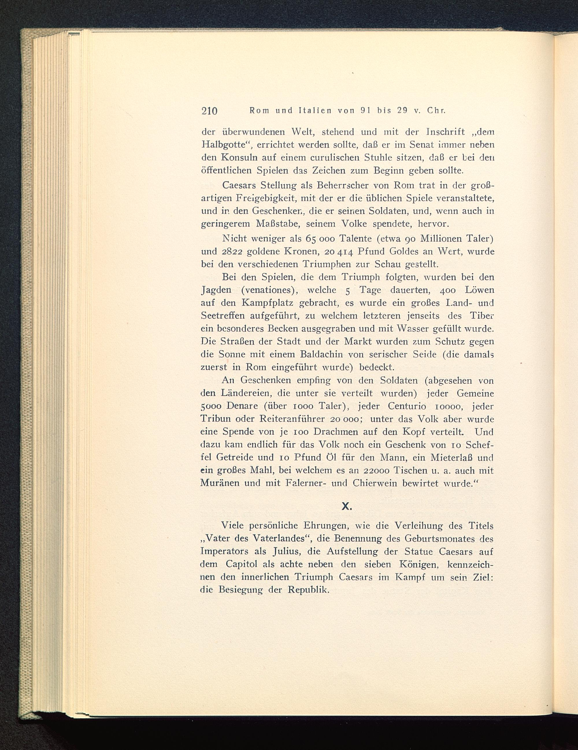Caesars Stellung als Beherrscher von Rom trat in der groß-artigen Freigebigkeit, mit der er die üblichen Spiele veranstaltete,und in den Geschenken, die er seinen Soldaten, und, wenn auch ingeringerem Maßstabe, seinem Volke spendete, hervor.