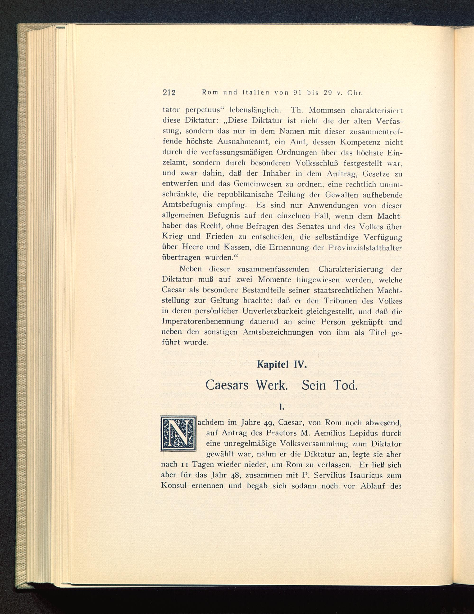 lator perpetuus“ lebenslänglich. Th. Mommsen charakterisiertdiese Diktatur: „Diese Diktatur ist nicht die der alten Verfas-sung, sondern das nur in dem Namen mit dieser zusammentref-fende höchste Ausnahmeamt, ein Amt, dessen Kompetenz nichtdurch die verfassungsmäßigen Ordnungen über das höchste Ein-zelamt, sondern durch besonderen Volksschluß festgestellt war,und zwar dahin, daß der Inhaber in dem Auftrag, Gesetze zuentwerfen und das Gemeinwesen zu ordnen, eine rechtlich unum-schränkte, die republikanische Teilung der Gewalten aufhebendeAmtsbefugnis empfing. Es sind nur Anwendungen von dieserallgemeinen Befugnis auf den einzelnen Fall, wenn dem Macht-haber das Recht, ohne Befragen des Senates und des Volkes überKrieg und Frieden zu entscheiden, die selbständige Verfügungüber Heere und Kassen, die Ernennung der Provinzialstatthalterübertragen wurden.“