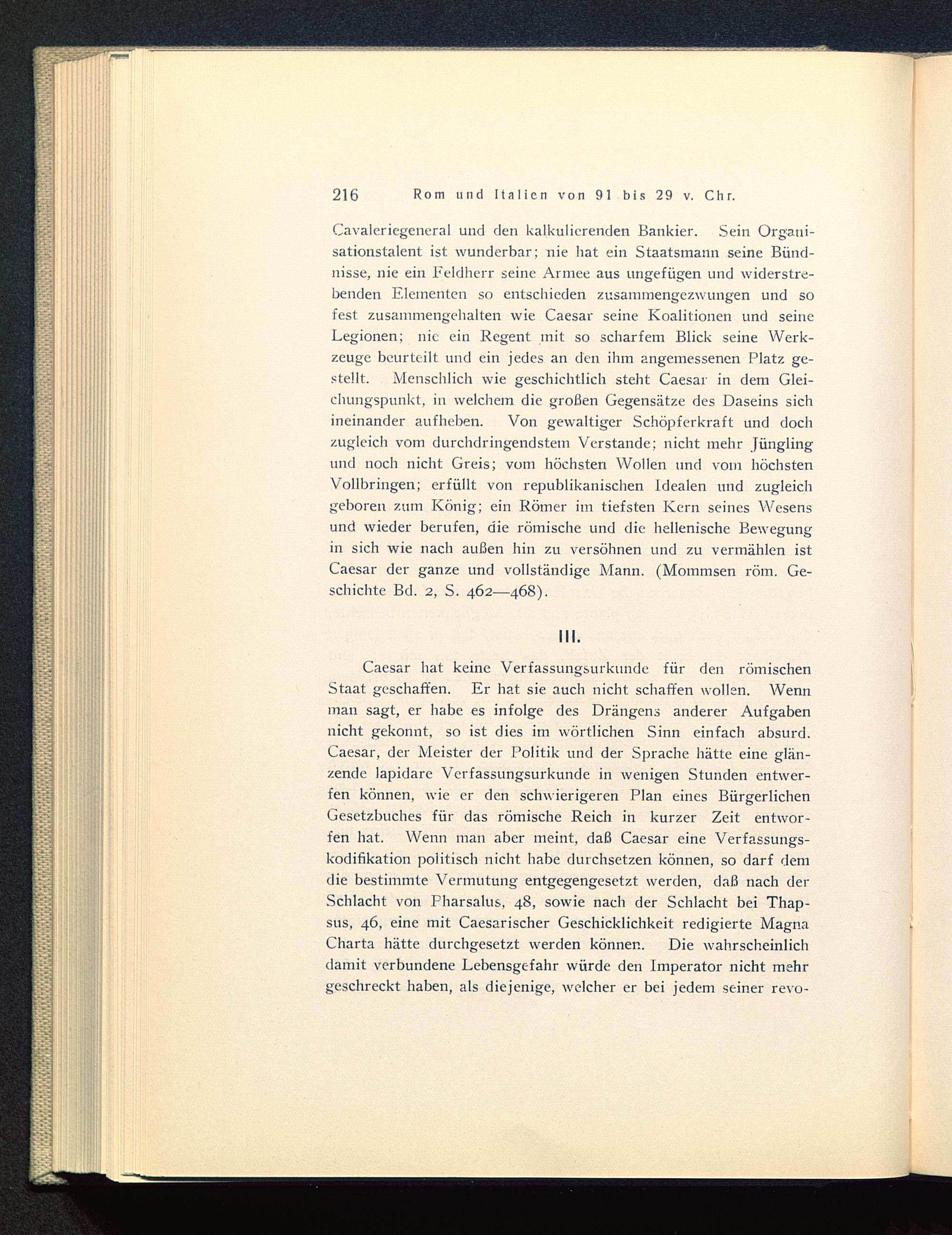 Caesar hat keine Verfassungsurkunde für den römischenStaat geschaffen. Er hat sie auch nicht schaffen wollen. Wennman sagt, er habe es infolge des Drängens anderer Aufgabennicht gekonnt, so ist dies im wörtlichen Sinn einfach absurd.Caesar, der Meister der Politik und der Sprache hätte eine glän-zende lapidare Verfassungsurkunde in wenigen Stunden entwer-fen können, wie er den schwierigeren Plan eines BürgerlichenGesetzbuches für das römische Reich in kurzer Zeit entwor-fen hat. Wenn man aber meint, daß Caesar eine Verfassungs-kodifikation politisch nicht habe durchsetzen können, so darf demdie bestimmte Vermutung entgegengesetzt werden, daß nach derSchlacht von Fharsalus, 48, sowie nach der Schlacht bei Thap-sus, 46, eine mit Caesarischer Geschicklichkeit redigierte MagnaCharta hätte durchgesetzt werden können. Die wahrscheinlichdamit verbundene Lebensgefahr würde den Imperator nicht mehrgeschreckt haben, als diejenige, welcher er bei jedem seiner revo-