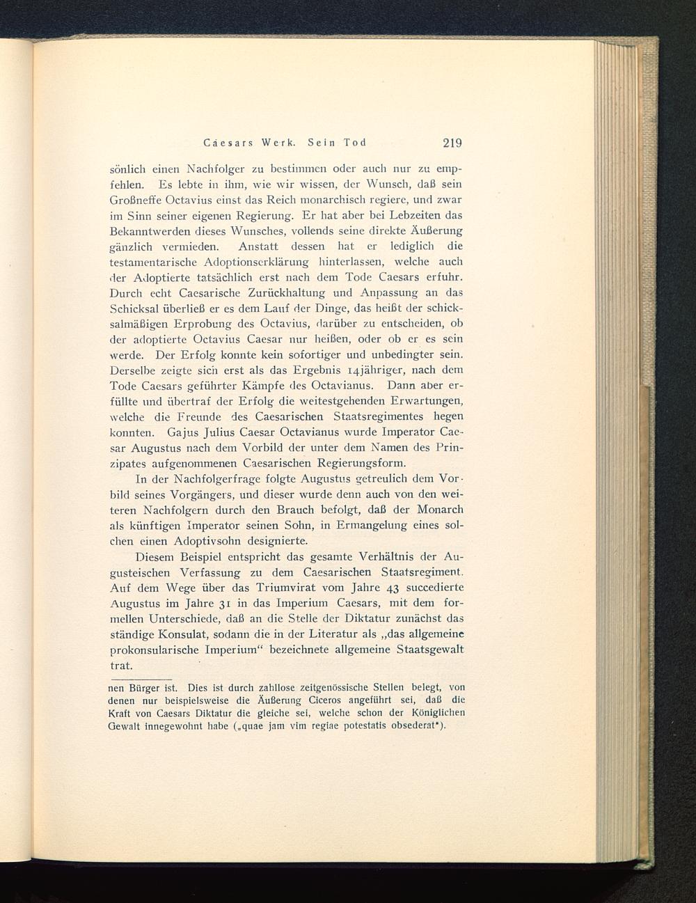 sönlich einen Nachfolger zu bestimmen oder auch nur zu emp-fehlen. Es lebte in ihm, wie wir wissen, der Wunsch, daß seinGroßneffe Octavius einst das Reich monarchisch regiere, und zwarim Sinn seiner eigenen Regierung. Er hat aber bei Lebzeiten dasBekanntwerden dieses Wunsches, vollends seine direkte Äußerunggänzlich vermieden. Anstatt dessen hat er lediglich dietestamentarische Adoptionserklärung hinterlassen, welche auchder Adoptierte tatsächlich erst nach dem Tode Caesars erfuhr.Durch echt Caesarische Zurückhaltung und Anpassung an dasSchicksal überließ er es dem Lauf der Dinge, das heißt der schick-salmäßigen Erprobung des Octavius, darüber zu entscheiden, obder adoptierte Octavius Caesar nur heißen, oder ob er es seinwerde. Der Erfolg konnte kein sofortiger und unbedingter sein.Derselbe zeigte sich erst als das Ergebnis I4j'ähriger, nach demTode Caesars geführter Kämpfe des Octavianus . Dann aber er-füllte und übertraf der Erfolg die weitestgehenden Erwartungen,welche die Freunde des Caesarischen Staatsregimentes hegenkonnten. Gajus Julius Caesar Octavianus wurde Imperator Cae-sar Augustus nach dem Vorbild der unter dem Namen des Prin-zipates aufgenommenen Caesarischen Regierungsform.