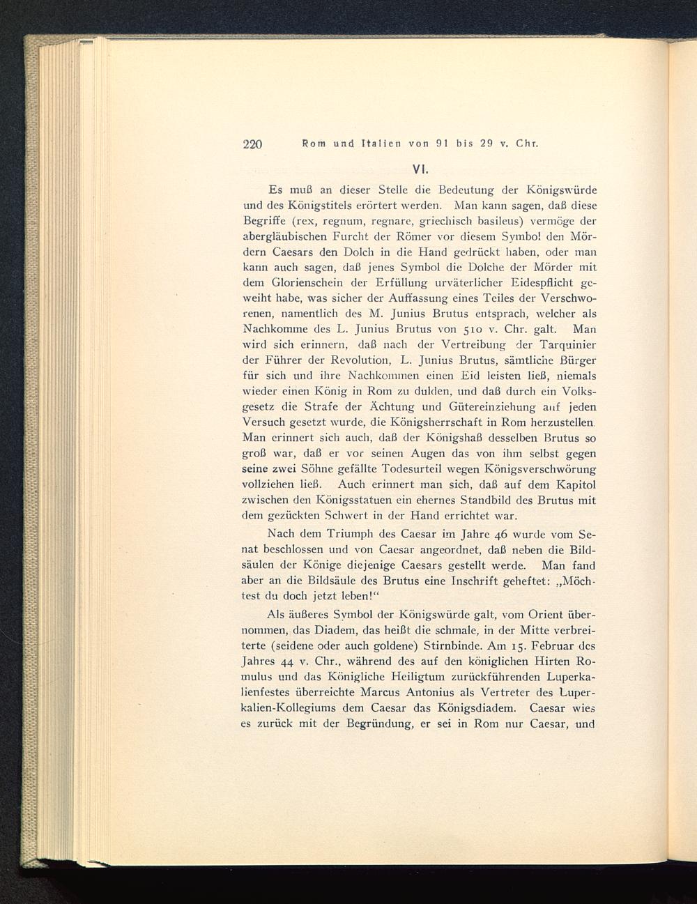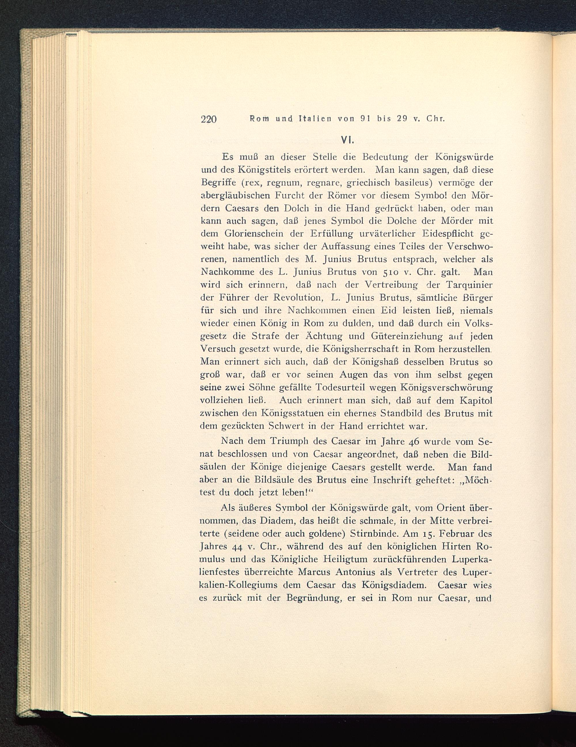 Es muß an dieser Stelle die Bedeutung der Königswürdeund des Königstitels erörtert werden. Man kann sagen, daß dieseBegriffe (rex, regnum, regnare, griechisch basileus) vermöge derabergläubischen Furcht der Römer vor diesem Symbol den Mör-dern Caesars den Dolch in die Hand gedrückt haben, oder mankann auch sagen, daß jenes Symbol die Dolche der Mörder mitdem Glorienschein der Erfüllung urväterlicher Eidespflicht ge-weiht habe, was sicher der Auffassung eines Teiles der Verschwo-renen, namentlich des M. Junius Brutus entsprach, welcher alsNachkomme des L. Junius Brutus von 510 v. Chr. galt. Manwird sich erinnern, daß nach der Vertreibung der Tarquinierder Führer der Revolution, L. Junius Brutus, sämtliche Bürgerfür sich und ihre Nachkommen einen Eid leisten ließ, niemalswieder einen König in Rom zu dulden, und daß durch ein Volks-gesetz die Strafe der Ächtung und Gütereinziehung auf jedenVersuch gesetzt wurde, die Königsherrschaft in Rom herzustellen.Man erinnert sich auch, daß der Königshaß desselben Brutus sogroß war, daß er vor seinen Augen das von ihm selbst gegenseine zwei Söhne gefällte Todesurteil wegen Königsverschwörungvollziehen ließ. Auch erinnert man sich, daß auf dem Kapitolzwischen den Königsstatuen ein ehernes Standbild des Brutus mitdem gezückten Schwert in der Hand errichtet war.