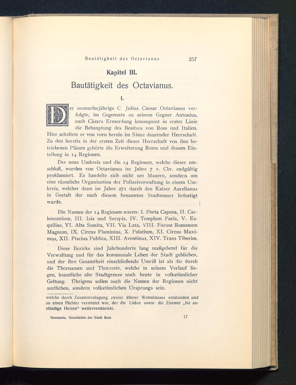 Der neue Umkreis und die 14 Regionen, welche dieser um-schloß, wurden von Octavianus im Jahre 7 v. Chr. endgültigproklamiert. Es handelte sich nicht um Mauern, sondern umeine räumliche Organisation der Polizeiverwaltung in einem Um-kreis, welcher dann im Jahre 271 durch den Kaiser Aurelianusin Gestalt der nach diesem benannten Stadtmauer befestigtwurde.
