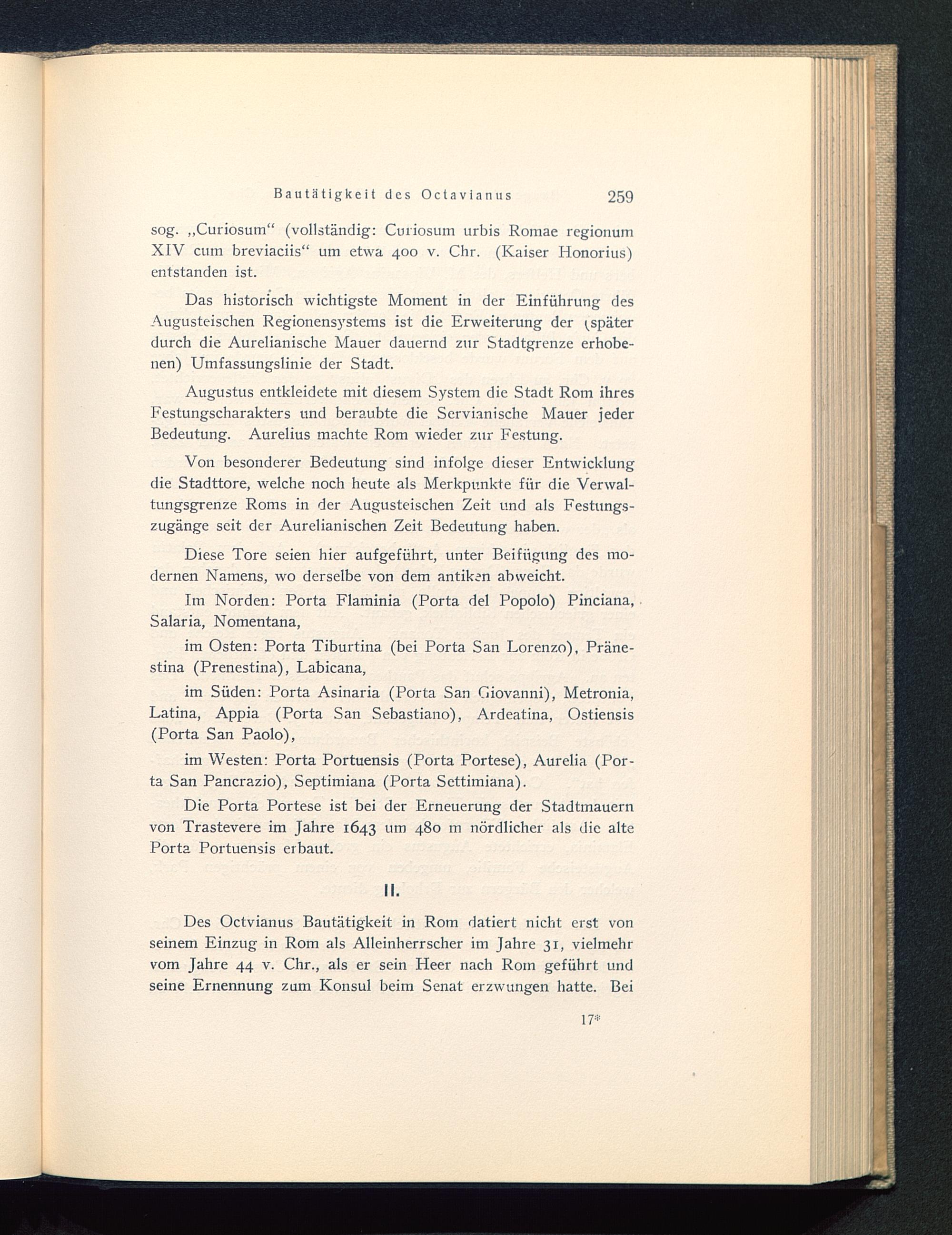 Von besonderer Bedeutung sind infolge dieser Entwicklungdie Stadttore, welche noch heute als Merkpunkte für die Verwal-tungsgrenze Roms in der Augusteischen Zeit und als Festungs-zugänge seit der Aurelianischen Zeit Bedeutung haben.