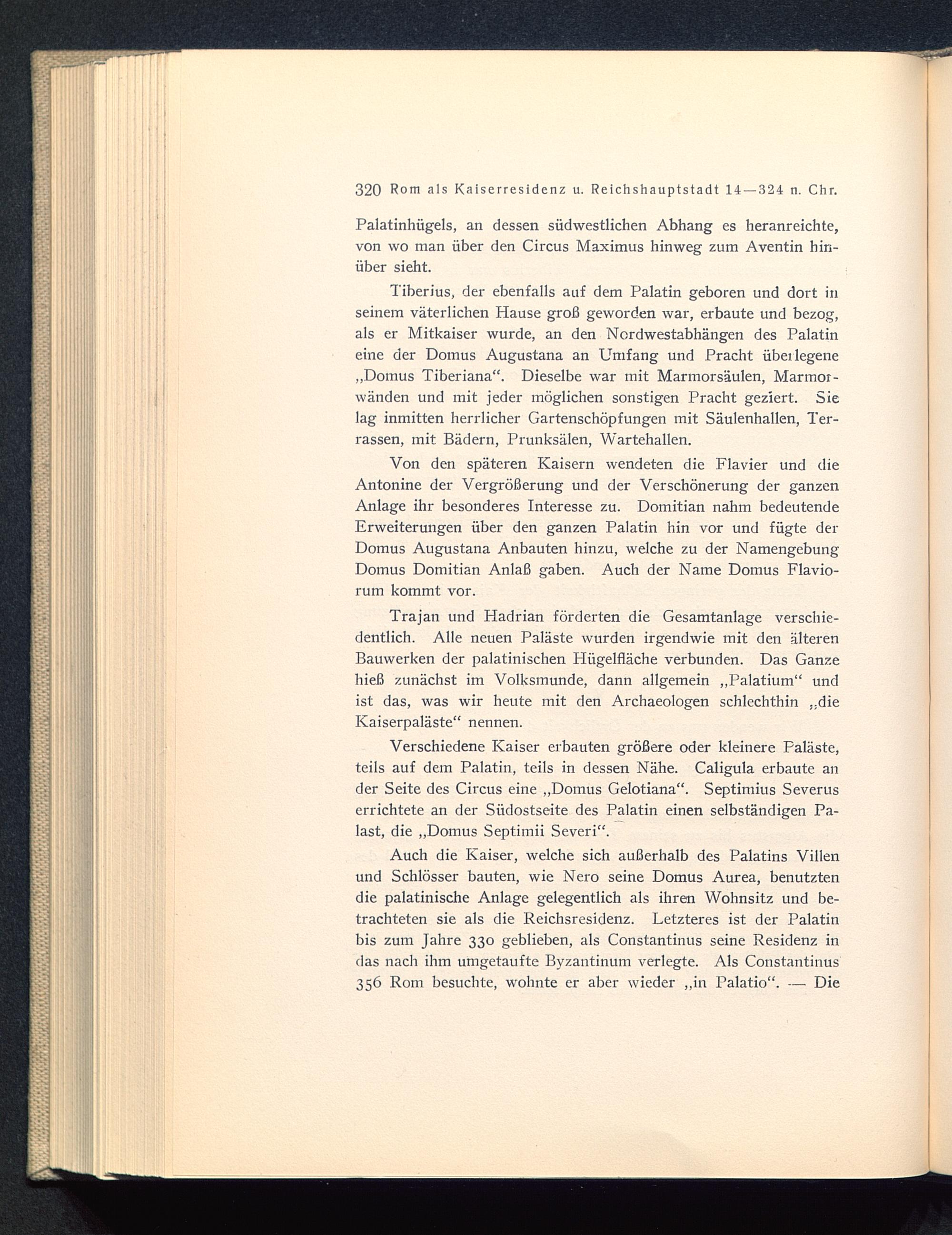 Trajan und Hadrian förderten die Gesamtanlage verschie-dentlich. Alle neuen Paläste wurden irgendwie mit den älterenBauwerken der palatinischen Hügelfläche verbunden. Das Ganzehieß zunächst im Volksmunde, dann allgemein „Palatium “ undist das, was wir heute mit den Archaeologen schlechthin „dieKaiserpaläste“ nennen.