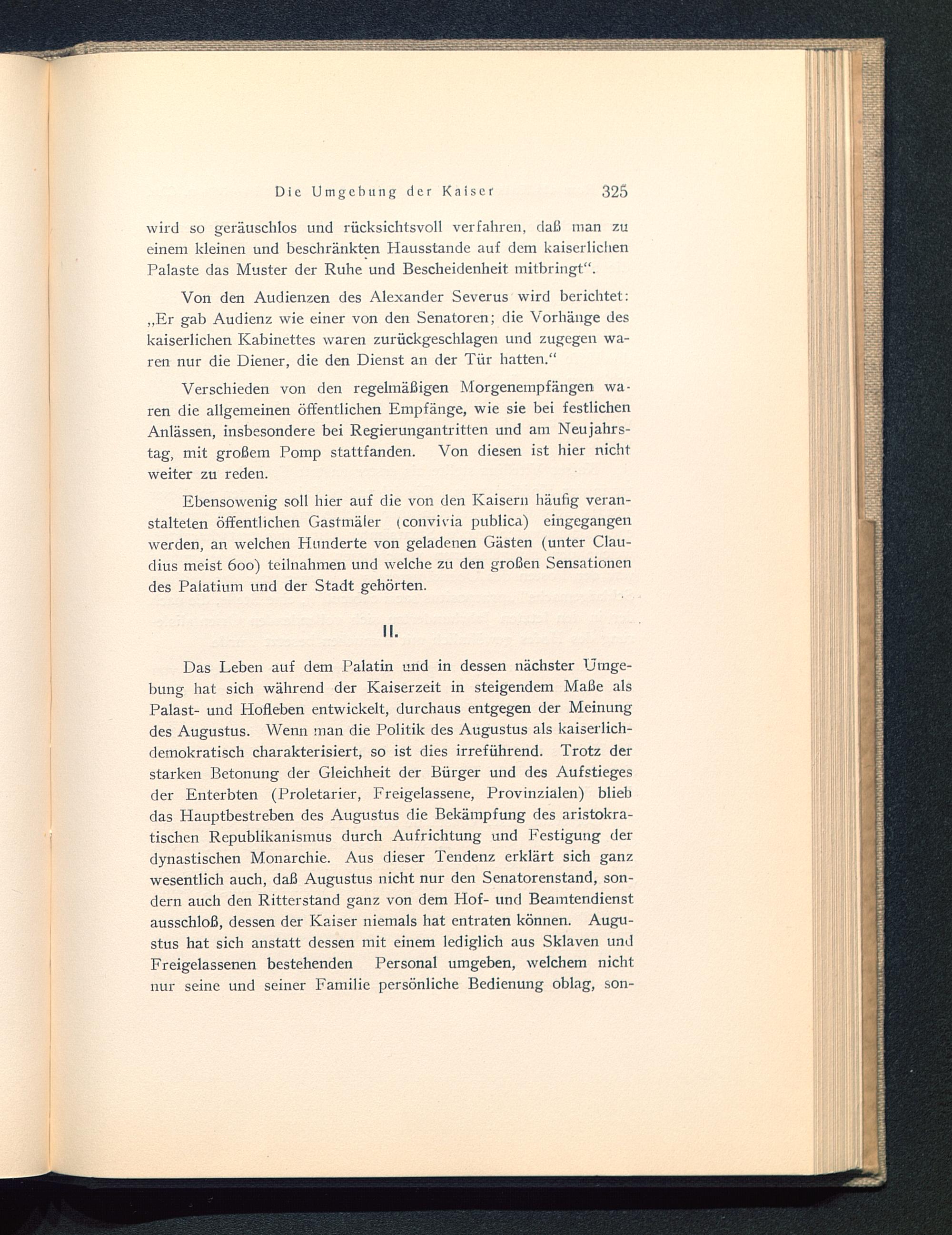 Von den Audienzen des Alexander Severus wird berichtet:„Er gab Audienz wie einer von den Senatoren; die Vorhänge deskaiserlichen Kabinettes waren zurückgeschlagen und zugegen wa-ren nur die Diener, die den Dienst an der Tür hatten.“