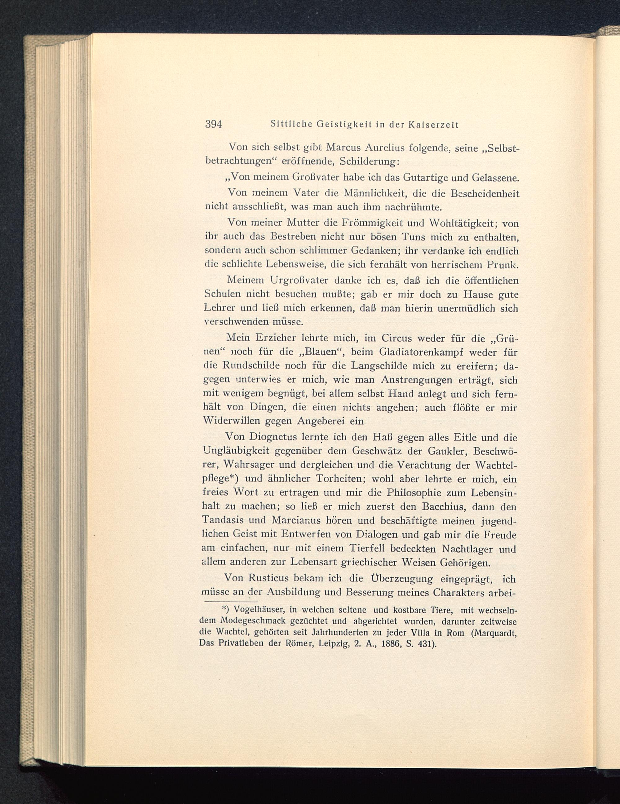 Von Diognetus lernte ich den Haß gegen alles Eitle und dieUngläubigkeit gegenüber dem Geschwätz der Gaukler, Beschwö-rer, Wahrsager und dergleichen und die Verachtung der Wachtel-pflege*) und ähnlicher Torheiten; wohl aber lehrte er mich, einfreies Wort zu ertragen und mir die Philosophie zum Lebensin-halt zu machen; so ließ er mich zuerst den Bacchius, dann denTandasis und Marcianus hören und beschäftigte meinen jugend-lichen Geist mit Entwerfen von Dialogen und gab mir die Freudeam einfachen, nur mit einem Tierfell bedeckten Nachtlager undallem anderen zur Lebensart griechischer Weisen Gehörigen.