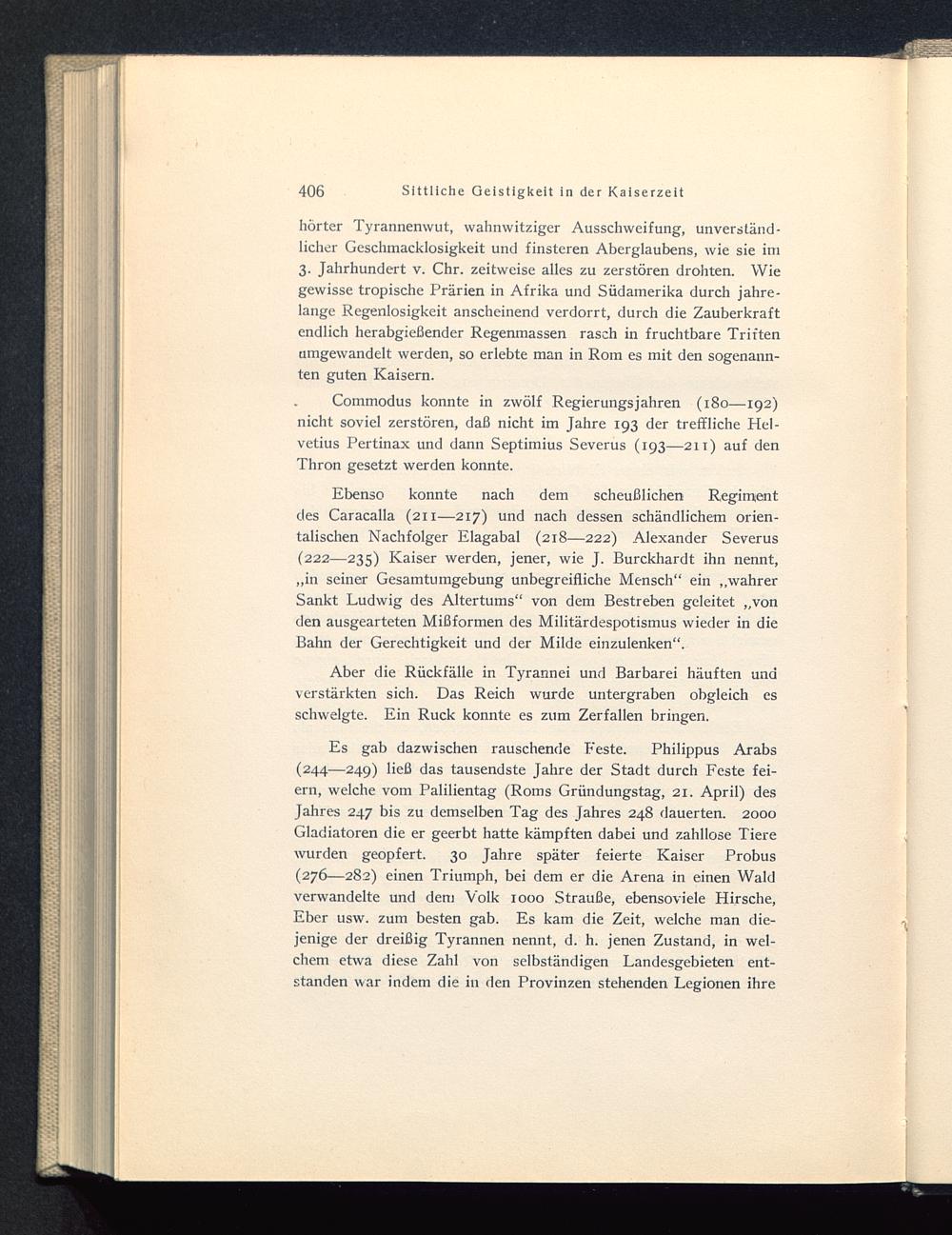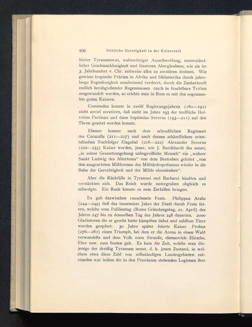 hörter Tyrannenwut, wahnwitziger Ausschweifung, unverständ-licher Geschmacklosigkeit und finsteren Aberglaubens, wie sie im3. Jahrhundert v. Chr. zeitweise alles zu zerstören drohten. Wiegewisse tropische Prärien in Afrika und Südamerika durch jahre-lange Regenlosigkeit anscheinend verdorrt, durch die Zauberkraftendlich herabgießender Regenmassen rasch in fruchtbare Triftenumgewandelt werden, so erlebte man in Rom es mit den sogenann-ten guten Kaisern.