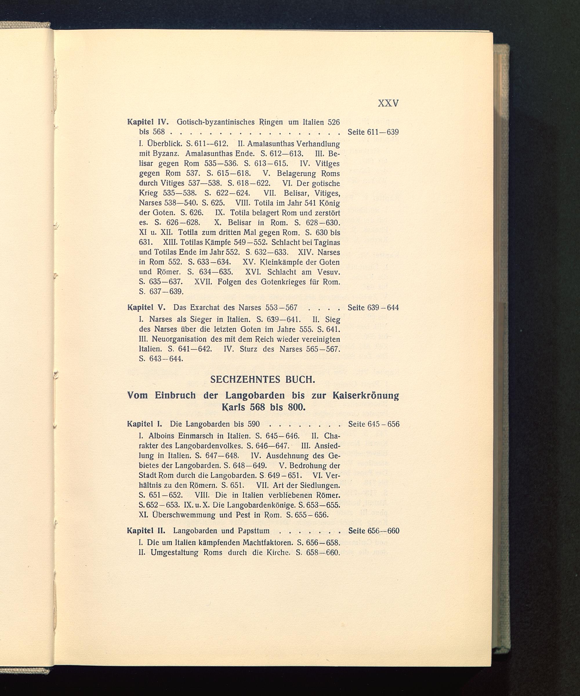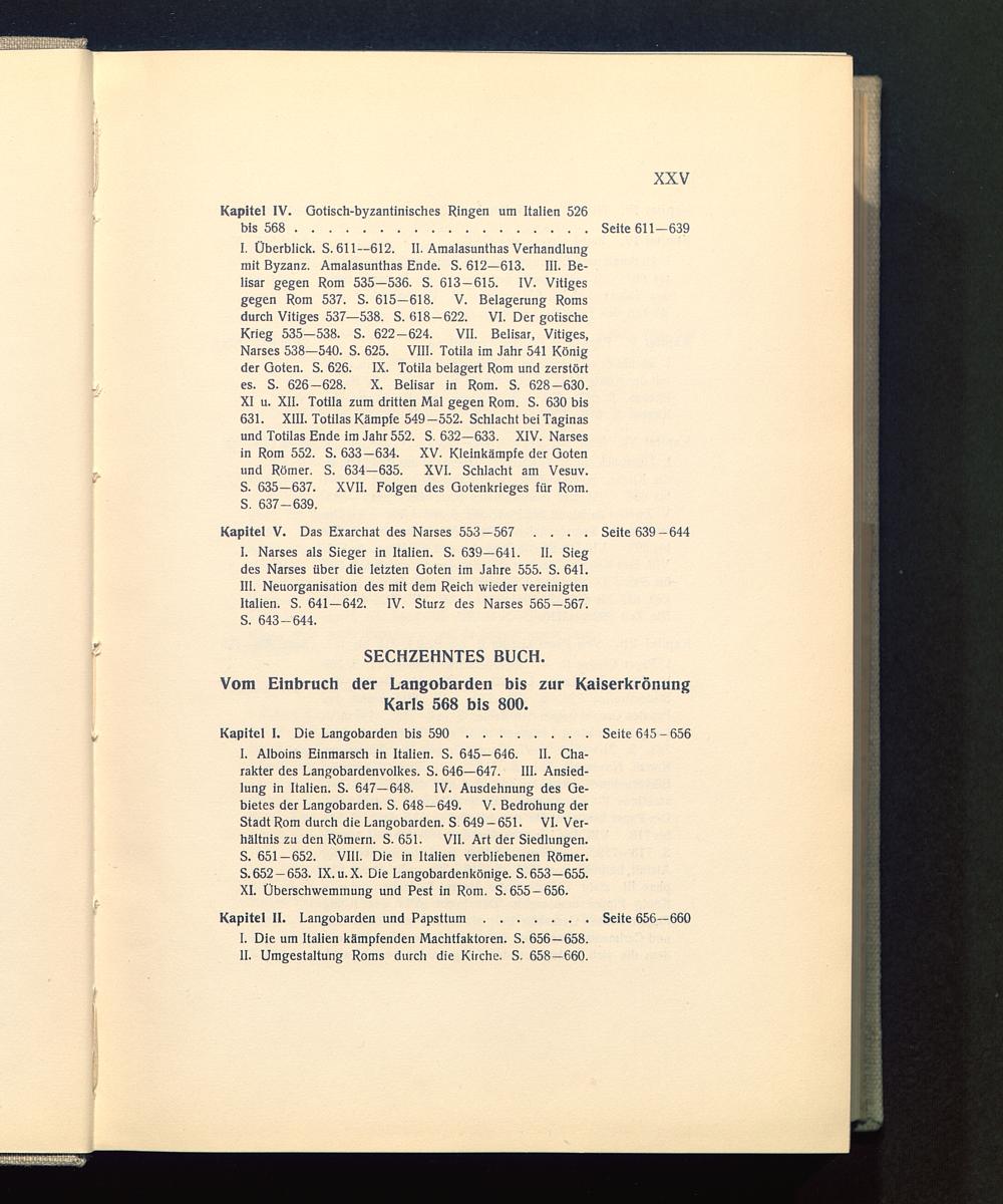 XI u. XII. Totila zum dritten Mal gegen Rom. S. 630 bis631. XIII. Totilas Kämpfe 549—552. Schlacht bei Taginasund Totilas Ende im Jahr 552. S. 632—633. XIV. Narsesin Rom 552. S. 633—634. XV. Kleinkämpfe der Gotenund Römer. S. 634—635. XVI. Schlacht am Vesuv.