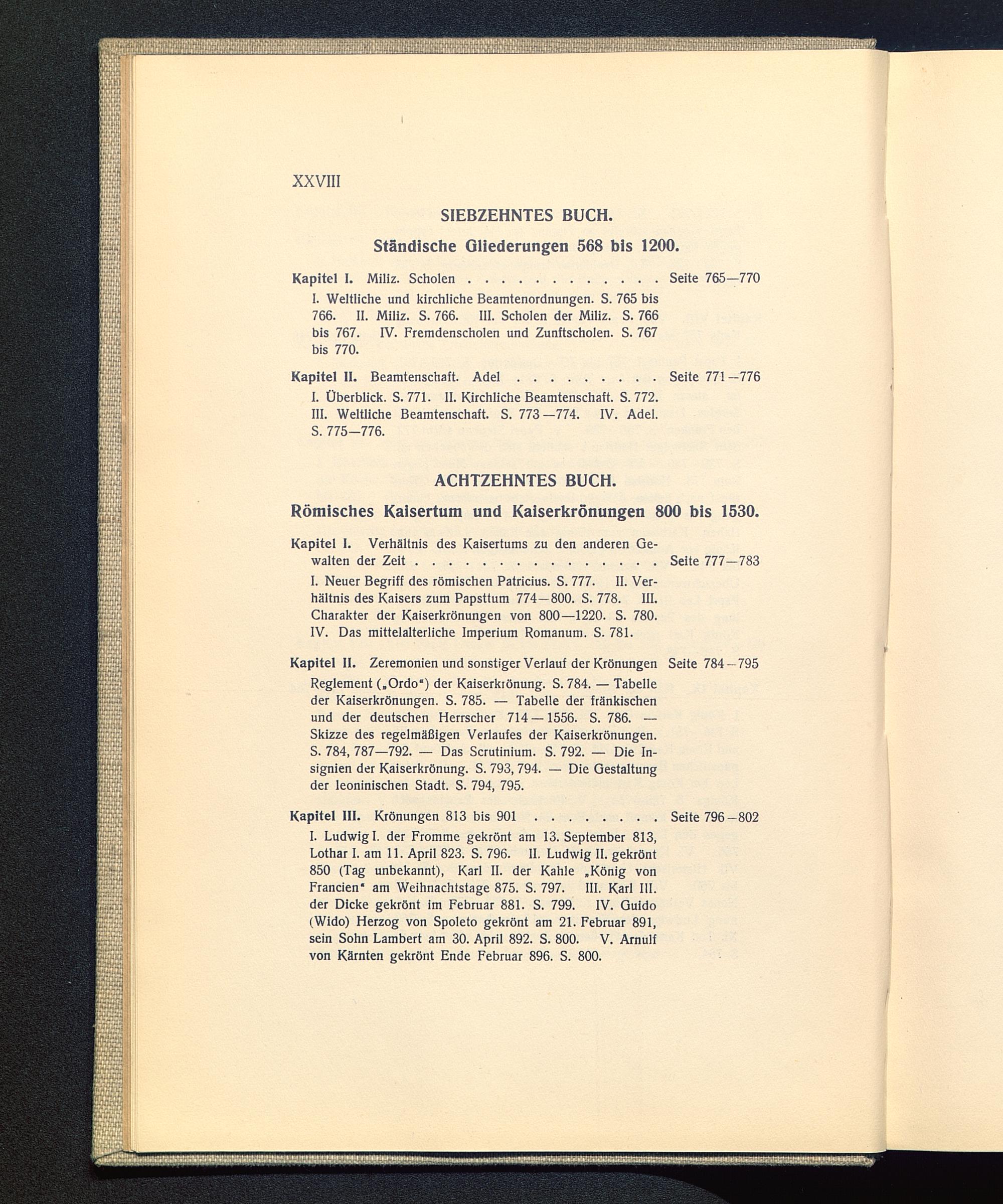 Kapitel II. Zeremonien und sonstiger Verlauf der Krönungen Seite 784—795Reglement („Ordo“) der Kaiserkiönung. S. 784. — Tabelleder Kaiserkrönungen. S. 785. — Tabelle der fränkischenund der deutschen Herrscher 714 —1556. S. 786. —