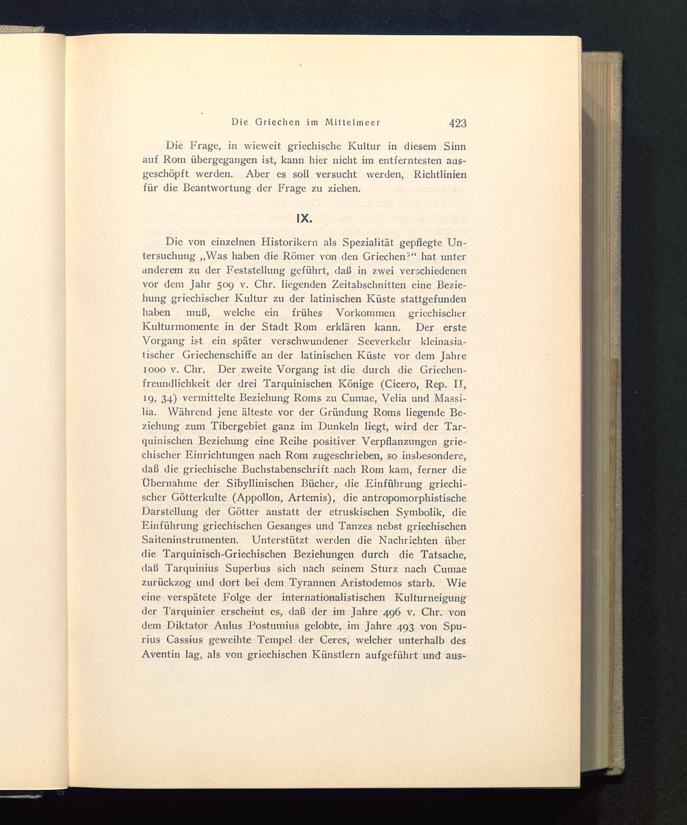 Die von einzelnen Historikern als Spezialität gepflegte Un-tersuchung „Was haben die Römer von den Griechen 5 “ hat unteranderem zu der Feststellung geführt, daß in zwei verschiedenenvor dem Jahr 509 v. Chr. liegenden Zeitabschnitten eine Bezie-hung griechischer Kultur zu der latinischen Küste stattgefundenhaben muß, welche ein frühes Vorkommen griechischerKulturmomente in der Stadt Rom erklären kann. Der ersteVorgang ist ein später verschwundener Seeverkehr kleinasia-tischer Griechenschiffe an der latinischen Küste vor dem Jahre1000 v. Chr. Der zweite Vorgang ist die durch die Griechen-freundlichkeit der drei Tarquinischen Könige (Cicero, Rep. II,19, 34) vermittelte Beziehung Roms zu Cumac, Velia und Massi-lia. Während jene älteste vor der Gründung Roms liegende Be-ziehung zum Tibergebiet ganz im Dunkeln liegt, wird der Tar-quinischen Beziehung eine Reihe positiver Verpflanzungen grie-chischer Einrichtungen nach Rom zugeschrieben, so insbesondere,daß die griechische Buchstabenschrift nach Rom kam, ferner dieÜbernahme der Sibyllinischen Bücher, die Einführung griechi-scher Götterkulte (Appollon, Artemis), die antropomorphistischeDarstellung der Götter anstatt der etruskischen Symbolik, dieEinführung griechischen Gesanges und Tanzes nebst griechischenSaiteninstrumenten. Unterstützt werden die Nachrichten überdie Tarquinisch-Griechischen Beziehungen durch die Tatsache,daß Tarquinius Superbus sich nach seinem Sturz nach Cumae zurückzog und dort bei dem Tyrannen Aristodemos starb. Wieeine verspätete Folge der internationalistischen Kulturneigungder Tarquinier erscheint es, daß der im Jahre 496 v. Chr. vondem Diktator Aulus Postumius gelobte, im Jahre 493 von Spu-rius Cassius geweihte Tempel der Ceres, welcher unterhalb desAventin lag, als von griechischen Künstlern aufgeführt und aus-