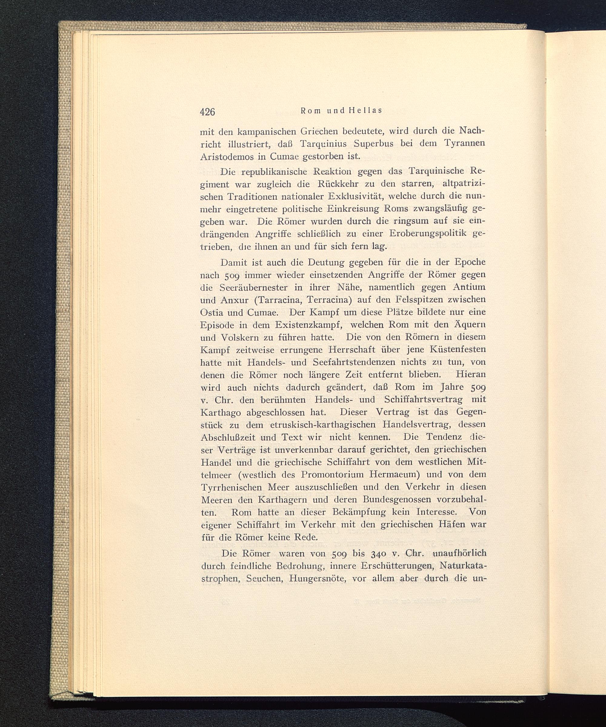 Damit ist auch die Deutung gegeben für die in der Epochenach 509 immer wieder einsetzenden Angriffe der Römer gegendie Seeräubernester in ihrer Nähe, namentlich gegen Antiumund Anxur (Tarracina, Terracina) auf den Felsspitzen zwischenOstia und Cumae . Der Kampf um diese Plätze bildete nur eineEpisode in dem Existenzkampf, welchen Rom mit den Äquertiund Volskern zu führen hatte. Die von den Römern in diesemKampf zeitweise errungene Herrschaft über jene Küstenfestenhatte mit Handels- und Seefahrtstendenzen nichts zu tun, vondenen die Römer noch längere Zeit entfernt blieben. Hieranwird auch nichts dadurch geändert, daß Rom im Jahre 509v. Chr. den berühmten Handels- und Schiffahrtsvertrag mitKarthago abgeschlossen hat. Dieser Vertrag ist das Gegen-stück zu dem etruskisch-karthagischen Handelsvertrag, dessenAbschlußzeit und Text wir nicht kennen. Die Tendenz die-ser Verträge ist unverkennbar darauf gerichtet, den griechischenHandel und die griechische Schiffahrt von dem westlichen Mit-telmeer (westlich des Promontorium Hermaeum) und von demTyrrhenischen Meer auszuschließen und den Verkehr in diesenMeeren den Karthagern und deren Bundesgenossen vorzubehal-ten. Rom hatte an dieser Bekämpfung kein Interesse. Voneigener Schiffahrt im Verkehr mit den griechischen Häfen warfür die Römer keine Rede.