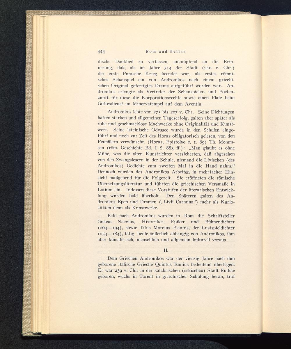 dische Danklied zu verfassen, anknüpfend an die Erin-nerung, daß, als im Jahre 514 der Stadt (240 v. Chr.)der erste Punische Krieg beendet war, als erstes römni-sches Schauspiel ein von Andronikos nach einem griechi-schen Original gefertigtes Drama aufgeführt worden war. An-dronikos erlangte als Vertreter der Schauspieler- und Poeten-zunft für diese die Korporationsrechte sowie einen Platz beimGottesdienst im Minervatempel auf dem Aventin.