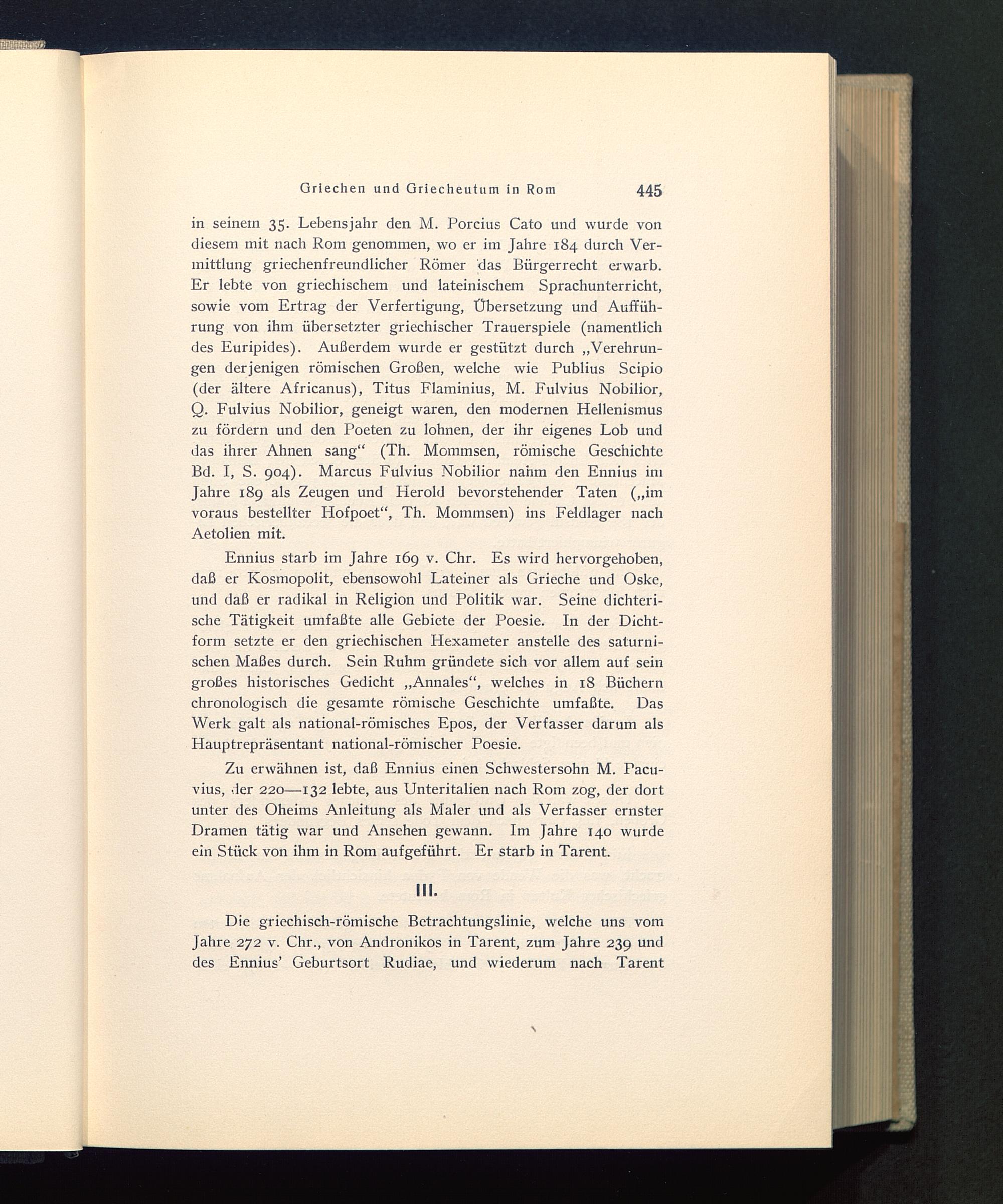 Ennius starb im Jahre 169 v. Chr. Es wird hervorgehoben,daß er Kosmopolit, ebensowohl Lateiner als Grieche und Oske,und daß er radikal in Religion und Politik war. Seine dichteri-sche Tätigkeit umfaßte alle Gebiete der Poesie. In der Dicht-form setzte er den griechischen Hexameter anstelle des saturni-schen Maßes durch. Sein Ruhm gründete sich vor allem auf seingroßes historisches Gedicht „Annales“, welches in 18 Büchernchronologisch die gesamte römische Geschichte umfaßte. DasWerk galt als national-römisches Epos, der Verfasser darum alsHauptrepräsentant national-römischer Poesie.