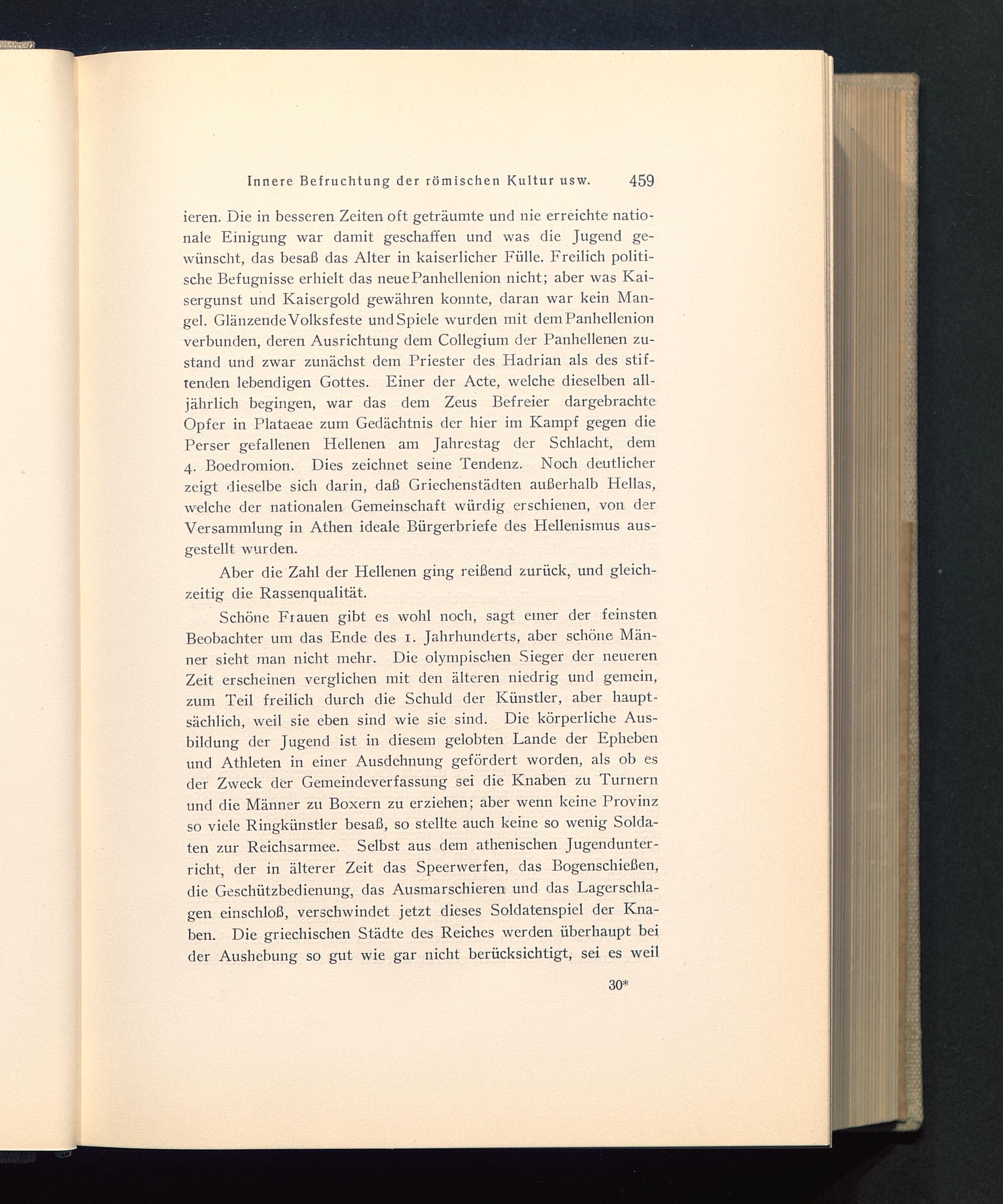 ieren. Die in besseren Zeiten oft geträumte und nie erreichte natio-nale Einigung war damit geschaffen und was die Jugend ge-wünscht, das besaß das Alter in kaiserlicher Fülle. Freilich politi-sche Befugnisse erhielt das neuePanhellenion nicht; aber was Kai-sergunst und Kaisergold gewähren konnte, daran war kein Man-gel. Glänzende Volksfeste und Spiele wurden mit demPanhellenionverbunden, deren Ausrichtung dem Collegium der Panhellenen zu-stand und zwar zunächst dem Priester des Hadrian als des stif-tenden lebendigen Gottes. Einer der Acte, welche dieselben all-jährlich begingen, war das dem Zeus Befreier dargebrachteOpfer in Plataeae zum Gedächtnis der hier im Kampf gegen diePerser gefallenen Hellenen am Jahrestag der Schlacht, dem4. Boedromion. Dies zeichnet seine Tendenz. Noch deutlicherzeigt dieselbe sich darin, daß Griechenstädten außerhalb Hellas,welche der nationalen Gemeinschaft würdig erschienen, von derVersammlung in Athen ideale Bürgerbriefe des Hellenismus aus-gestellt wurden.
