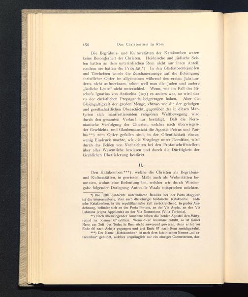 Die Begräbnis- und Kulturstätten der Katakomben warenkeine Besonderheit der Christen. Heidnische und jüdische Sek-ten hatten an dem unterirdischen Rom nicht nur ihren Anteil,sondern sie hatten die Priorität.*) In den Gladiatorenkämpfenund Tierhetzen wurde die Zuschauermenge auf die Beteiligungchristlicher Opfer im allgemeinen während des ersten Jahrhun-derts nicht aufmerksam, schon weil man die Juden und andere„östliche Leute“ nicht unterschied. Wenn, wie im Fall des Bi-schofs Ignatius von Antiochia (107) es anders war, so wird daszu der christlichen Propaganda beigetragen haben. Aber dieGleichgültigkeit der großen Menge, ebenso wie die der geistigenund gesellschaftlichen Oberschicht, gegenüber der in diesen Mar-tyrien sich manifestierenden religiösen Weltbewegung wirddurch den gesamten Verlauf nur bestätigt. Daß die Nero-nianische Verfolgung der Christen, welcher nach überwiegen-der Geschichts- und Glaubensansicht die Apostel Petrus und Pau-lus **) zum Opfer gefallen sind, in der Öffentlichkeit ebensowenig Eindruck machte, wie die Vorgänge unter Domitian , wirddurch das Fehlen von Nachrichten bei den Profanschriftstellernüber alles Wesentliche bewiesen und durch die Dürftigkeit derkirchlichen Überlieferung bestärkt.
