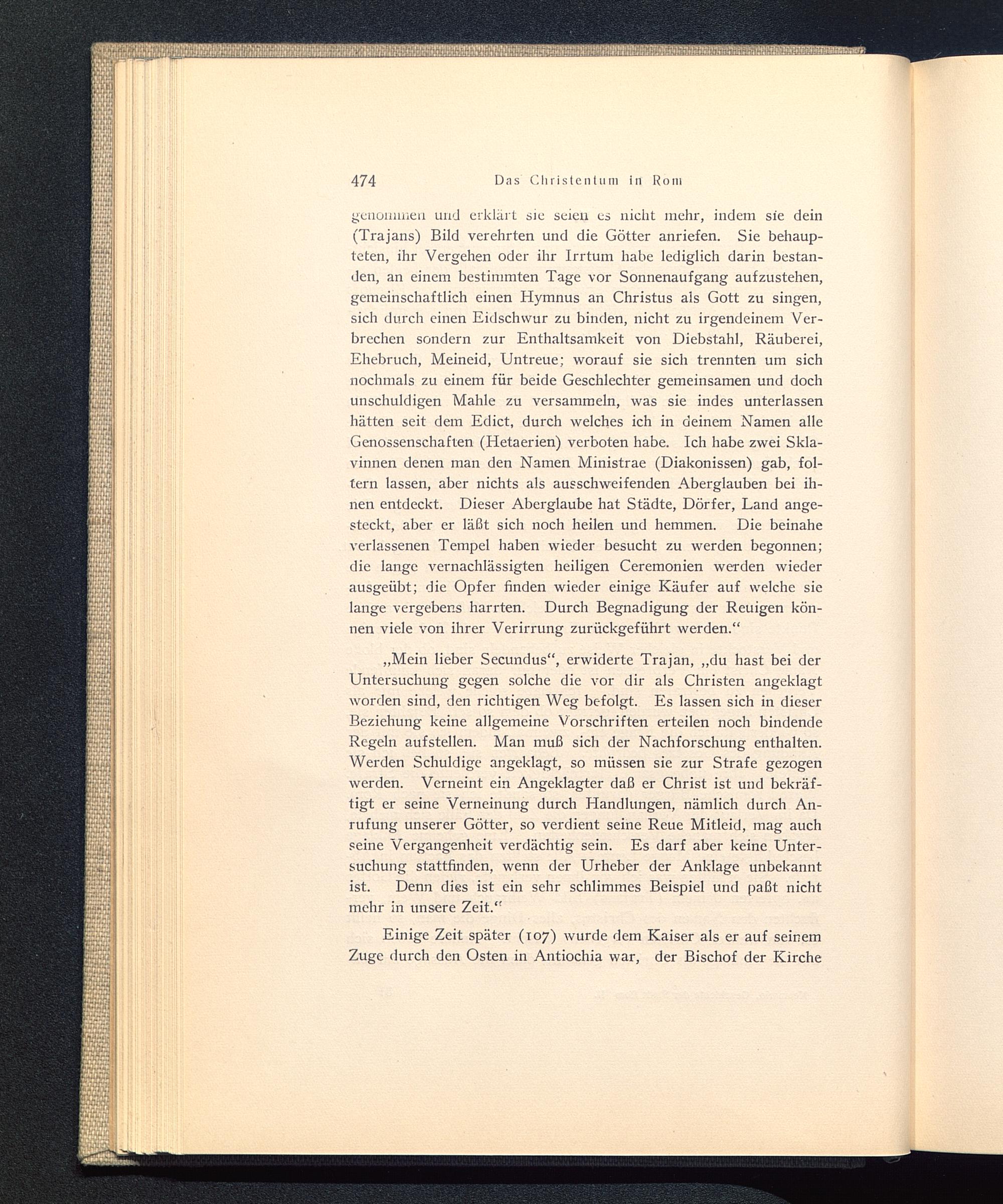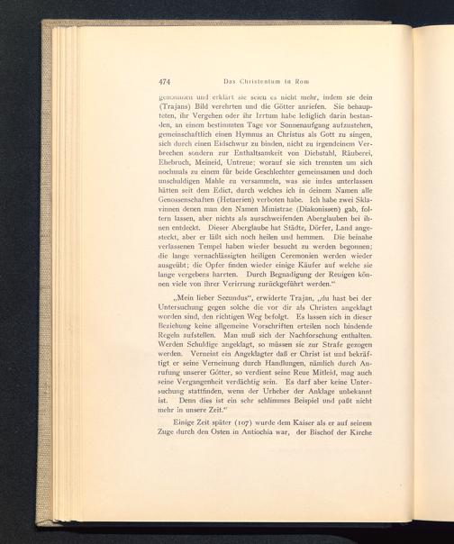 „Mein lieber Secundus“, erwiderte Trajan , „du hast bei derUntersuchung gegen solche die vor dir als Christen angeklagtworden sind, den richtigen Weg befolgt. Es lassen sich in dieserBeziehung keine allgemeine Vorschriften erteilen noch bindendeRegeln aufstellen. Man muß sich der Nachforschung enthalten.Werden Schuldige angeklagt, so müssen sie zur Strafe gezogenwerden. Verneint ein Angeklagter daß er Christ ist und bekräf-tigt er seine Verneinung durch Handlungen, nämlich durch An-rufung unserer Götter, so verdient seine Reue Mitleid, mag auchseine Vergangenheit verdächtig sein. Es darf aber keine Unter-suchung stattfinden, wenn der Urheber der Anklage unbekanntist. Denn dies ist ein sehr schlimmes Beispiel und paßt nichtmehr in unsere Zeit.“