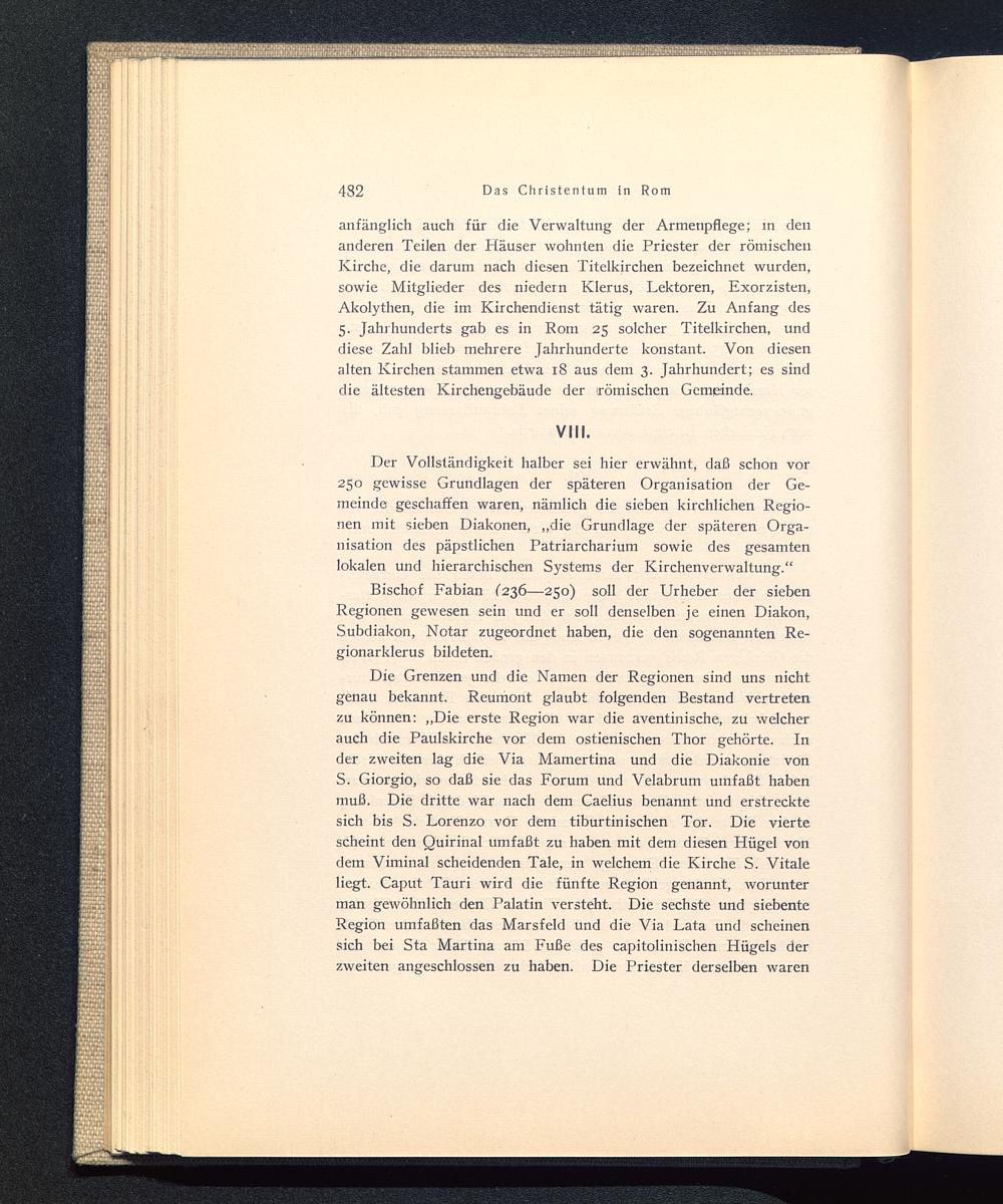 Die Grenzen und die Namen der Regionen sind uns nichtgenau bekannt. Reumont glaubt folgenden Bestand vertretenzu können: „Die erste Region war die aventinische, zu welcherauch die Paulskirche vor dem ostienischen Thor gehörte. Inder zweiten lag die Via Mamertina und die Diakonie vonS. Giorgio, so daß sie das Forum und Velabrum umfaßt habenmuß. Die dritte war nach dem Caelius benannt und erstrecktesich bis S. Lorenzo vor dem tiburtinischen Tor. Die viertescheint den Quirinal umfaßt zu haben mit dem diesen Hügel vondem Viminal scheidenden Tale, in welchem die Kirche S. Vitaleliegt. Caput Tauri wird die fünfte Region genannt, worunterman gewöhnlich den Palatin versteht. Die sechste und siebenteRegion umfaßten das Marsfeld und die Via Lata und scheinensich bei Sta Martina am Fuße des capitolinischen Hügels derzweiten angeschlossen zu haben. Die Priester derselben waren