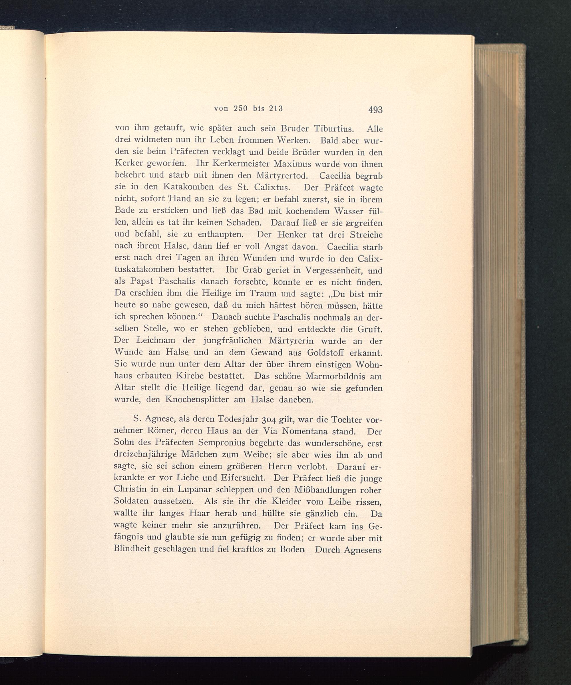 von ihm getauft, wie später auch sein Bruder Tiburtius. Alledrei widmeten nun ihr Leben frommen Werken. Bald aber wur-den sie beim Präfecten verklagt und beide Brüder wurden in denKerker geworfen. Ihr Kerkermeister Maximus wurde von ihnenbekehrt und starb mit ihnen den Märtyrertod. Caecilia begrubsie in den Katakomben des St. Calixtus . Der Präfect wagtenicht, sofort 'Hand an sie zu legen; er befahl zuerst, sie in ihremBade zu ersticken und ließ das Bad mit kochendem Wasser fül-len, allein es tat ihr keinen Schaden. Darauf ließ er sie ergreifenund befahl, sie zu enthaupten. Der Henker tat drei Streichenach ihrem Halse, dann lief er voll Angst davon. Caecilia starberst nach drei Tagen an ihren Wunden und wurde in den Calix-tuskatakomben bestattet. Ihr Grab geriet in Vergessenheit, undals Papst Paschalis danach forschte, konnte er es nicht finden.Da erschien ihm die Heilige im Traum und sagte: „Du bist mirheute so nahe gewesen, daß du mich hättest hören müssen, hätteich sprechen können.“ Danach suchte Paschalis nochmals an der-selben Stelle, wo er stehen geblieben, und entdeckte die Gruft.Der Leichnam der jungfräulichen Märtyrerin wurde an derWunde am Halse und an dem Gewand aus Goldstoff erkannt.Sie wurde nun unter dem Altar der über ihrem einstigen Wohn-haus erbauten Kirche bestattet. Das schöne Marmorbildnis amAltar stellt die Heilige liegend dar, genau so wie sie gefundenwurde, den Knochensplitter am Halse daneben.
