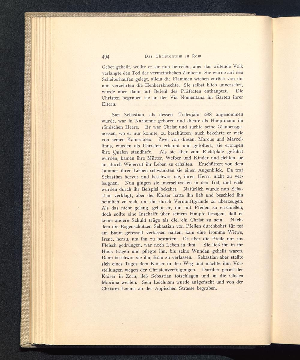 San Sebastian, als dessen Todesjahr 288 angenommenwurde, war in Narbonne geboren und diente als Hauptmann imrömischen Heere. Er war Christ und suchte seine Glaubensge-nossen, wo er nur konnte, zu beschützen; auch bekehrte er vielevon seinen Kameraden. Zwei von diesen, Marcus und Marcel-linus, wurden als Christen erkannt und gefoltert; sie ertrugenihre Qualen standhaft. Als sie aber zum Richtplatz geführtwurden, kamen ihre Mütter, Weiber und Kinder und flehten siean, durch Widerruf ihr Leben zu erhalten. Erschüttert von demJammer ihrer Lieben schwankten sie einen Augenblick. Da tratSebastian hervor und beschwor sie, ihren Herrn nicht zu ver-leugnen. Nun gingen sie unerschrocken in den Tod, und vielewurden durch ihr Beispiel bekehrt. Natürlich wurde nun Seba-stian verklagt; aber der Kaiser hatte ihn lieb und beschied ihnheimlich zu sich, um ihn durch Vernunftgründe zu überzeugen.Als das nicht gelang, gebot er, ihn mit Pfeilen zu erschießen,doch sollte eine Inschrift über seinem Haupte besagen, daß erkeine andere Schuld trüge als die, ein Christ zu sein. Nach-dem die Bogenschützen Sebastian von Pfeilen durchbohrt für totam Baum gefesselt verlassen hatten, kam eine fromme Witwe,Irene, herzu, um ihn zu bestatten. Da aber die Pfeile nur insFleisch gedrungen, war noch Leben in ihm. Sie ließ ihn in ihrHaus tragen und pflegte ihn, bis seine Wunden geheilt waren.Dann beschwor sie ihn, Rom zu verlassen. Sebastian aber stelltesich eines Tages dem Kaiser in den Weg und machte ihm Vor-stellungen wegen der Christenverfolgungen. Darüber geriet derKaiser in Zorn, ließ Sebastian totschlagen und in die CloacaMaxima werfen. Sein Leichnam wurde aufgefischt und von derChristin Lucina an der Appischen Strasse begraben.