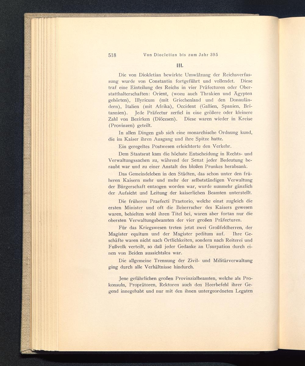 Die früheren Praefecti Praetorio, welche einst zugleich dieersten Minister und oft die Beherrscher des Kaisers gewesenwaren, behielten wohl ihren Titel bei, waren aber fortan nur dieobersten Verwaltungsbeamten der vier großen Präfecturen.