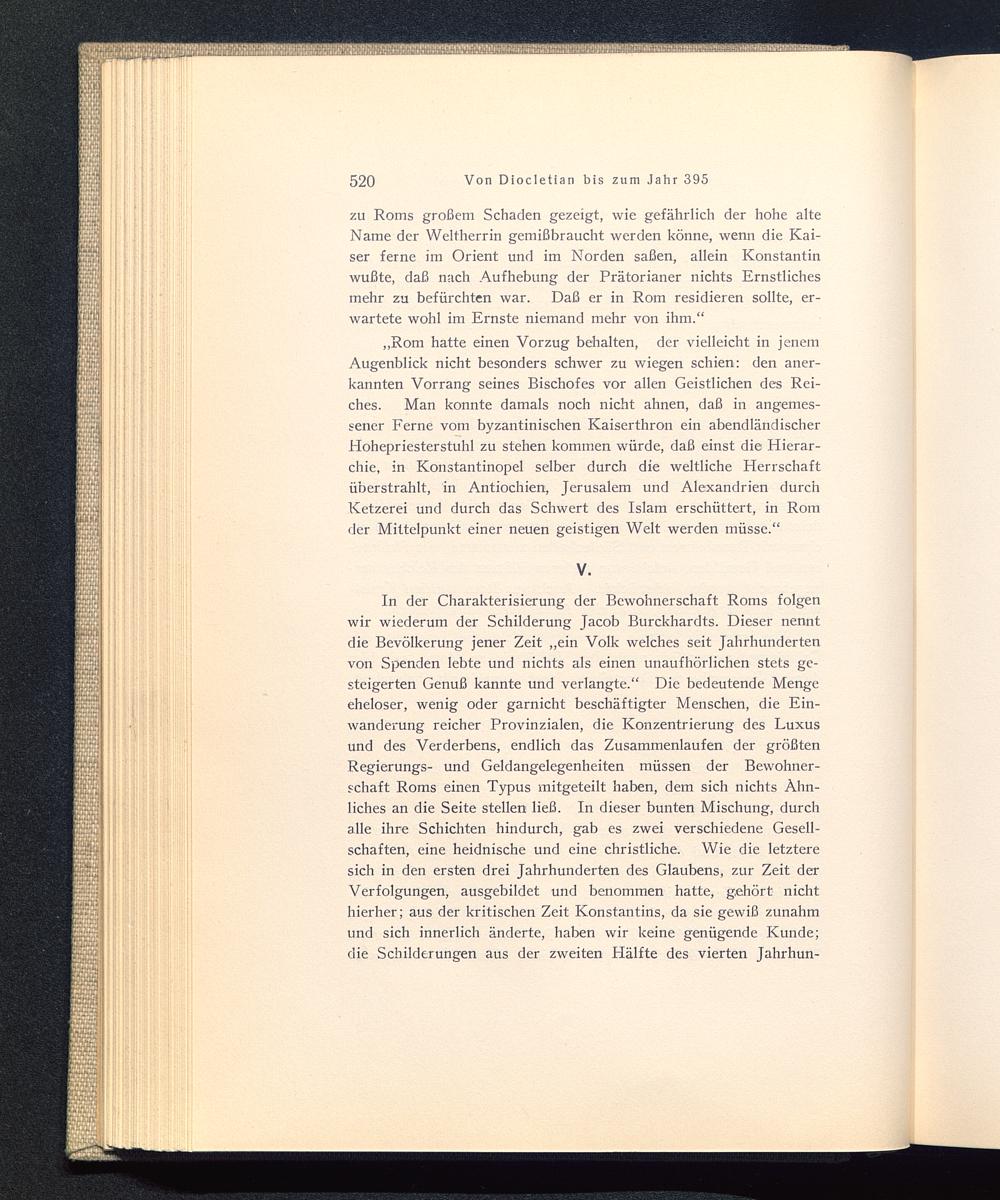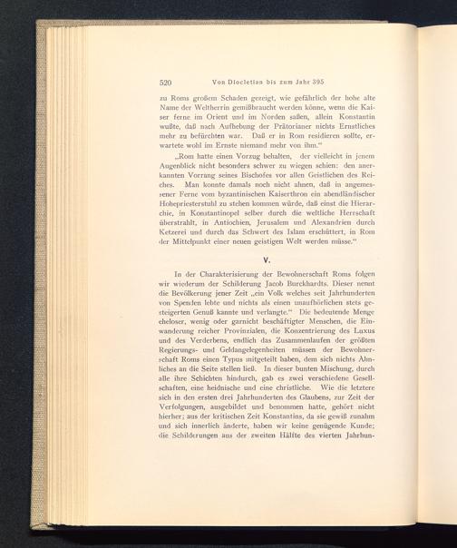 In der Charakterisierung der Bewohnerschaft Roms folgenwir wiederum der Schilderung Jacob Burckhardts. Dieser nenntdie Bevölkerung jener Zeit „ein Volk welches seit Jahrhundertenvon Spenden lebte und nichts als einen unaufhörlichen stets ge-steigerten Genuß kannte und verlangte.“ Die bedeutende Mengeeheloser, wenig oder garnicht beschäftigter Menschen, die Ein-wanderung reicher Provinzialen, die Konzentrierung des Luxusund des Verderbens, endlich das Zusammenlaufen der größtenRegierungs- und Geldangelegenheiten müssen der Bewohner-schaft Roms einen Typus mitgeteilt haben, dem sich nichts Ähn-liches an die Seite stellen ließ. In dieser bunten Mischung, durchalle ihre Schichten hindurch, gab es zwei verschiedene Gesell-schaften, eine heidnische und eine christliche. Wie die letzteresich in den ersten drei Jahrhunderten des Glaubens, zur Zeit derVerfolgungen, ausgebildet und benommen hatte, gehört nichthierher; aus der kritischen Zeit Konstantins, da sie gewiß zunahmund sich innerlich änderte, haben wir keine genügende Kunde;die Schilderungen aus der zweiten Hälfte des vierten Jahrhun-